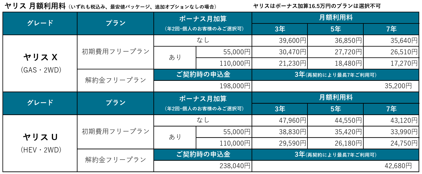 KINTOでのヤリス・ヤリス クロス一部改良モデルのご利用料金は、ヤリスが月額17,270円(税込み、「Xグレード」)*³から、ヤリス クロスが月額17,820円(税込み、「Uグレード」)から*⁴となります。