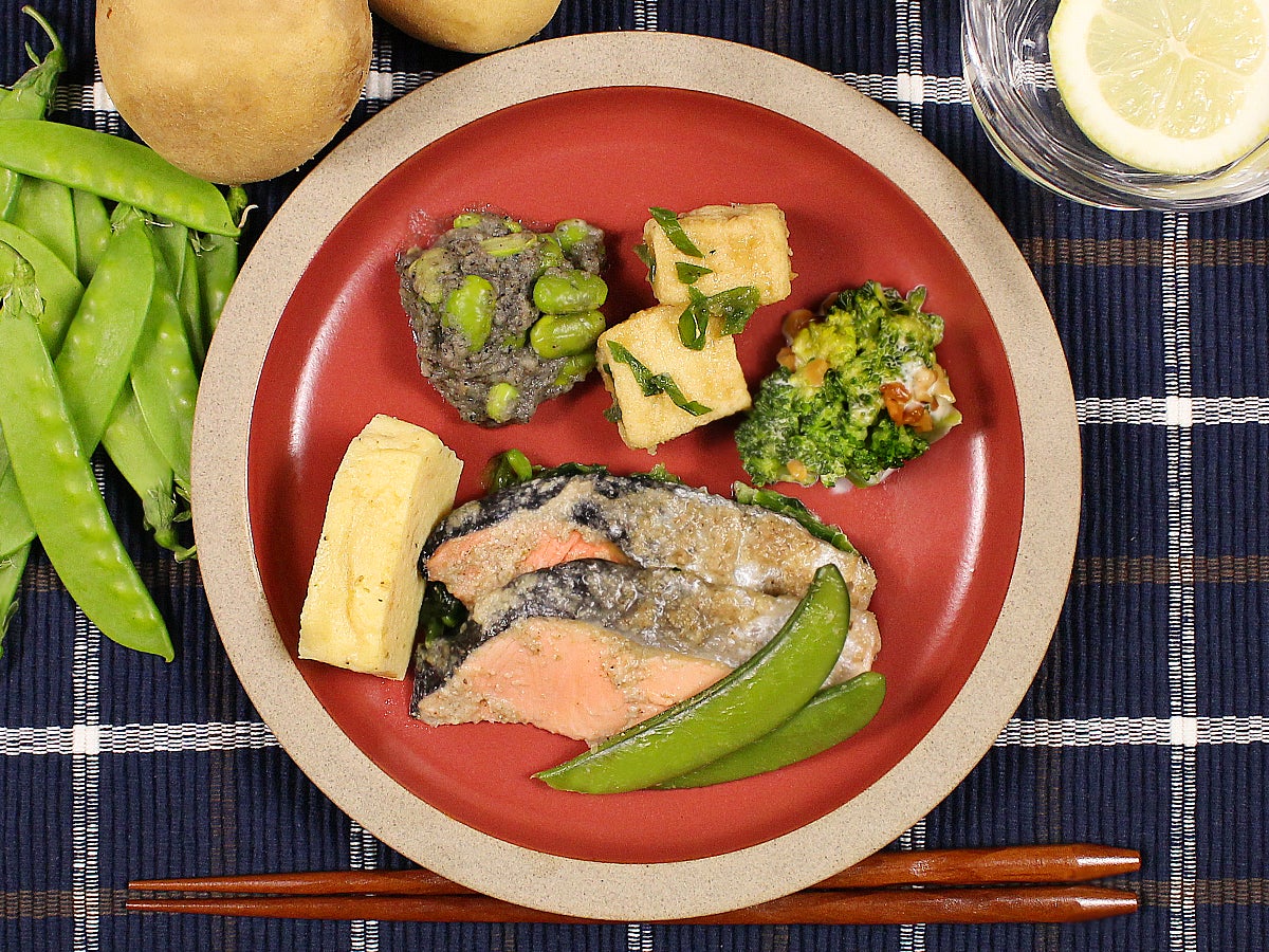 副菜は枝豆入りの黒ごまポテト、ねぎを加えた絹揚げの醤油だれ、ブロッコリーのからしマヨです。