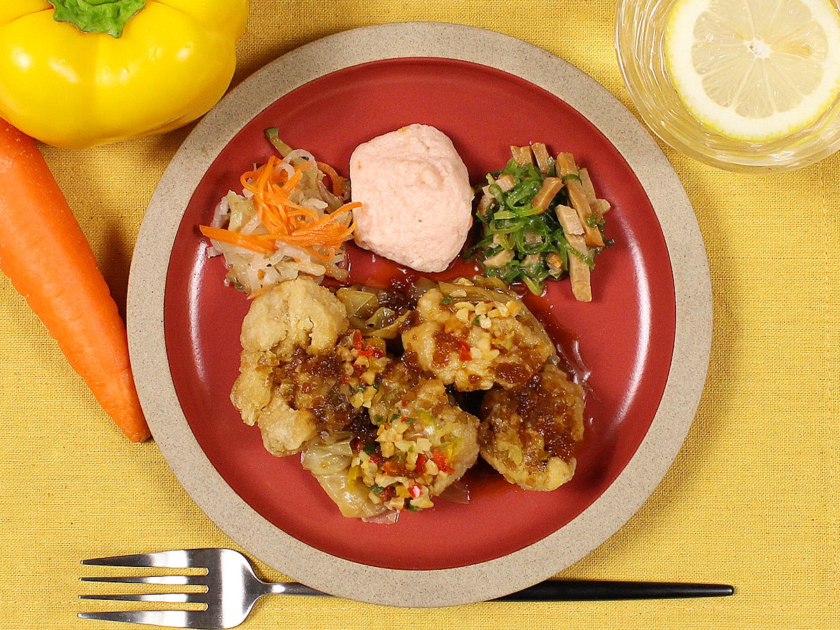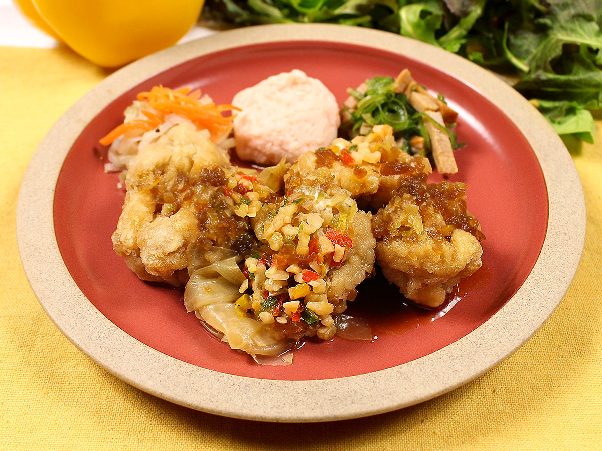 鶏もも肉のから揚げにナッシュ特製の香味だれをかけた油淋鶏をご用意しました。食欲そそる香味だれには、ねぎ・パプリカを使用し、少量のアーモンドが良いアクセントとなっております。下に敷いてあるキャベツとともにお召し上がりください。
