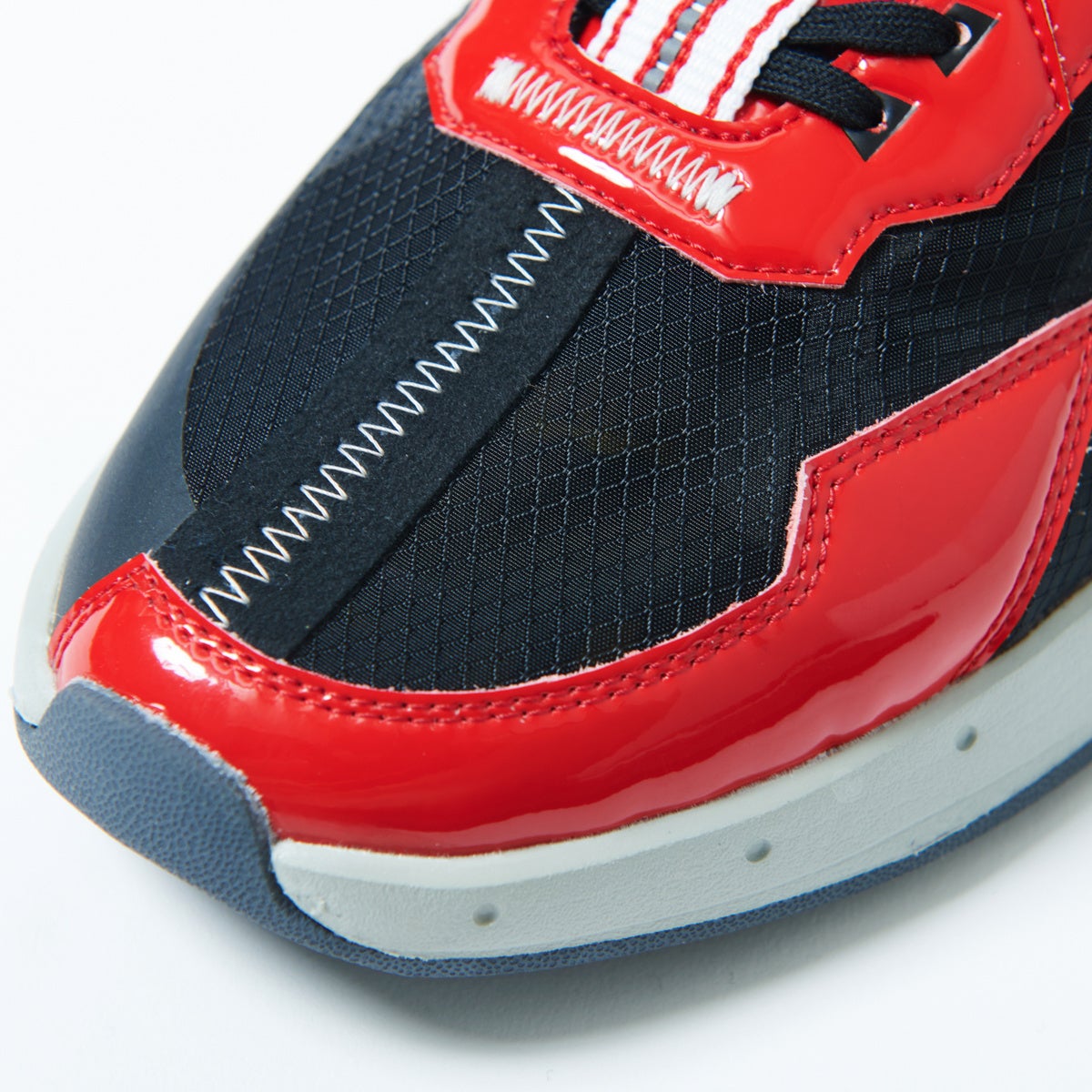 アッパーには薄く軽量の素材を使用することで、仮面ライダードライブのスピード感を表現すると共に、機械の重厚感にスポーツカーの軽量さも追加しています。