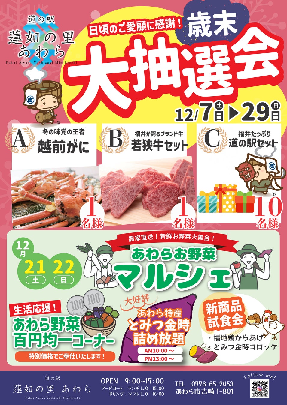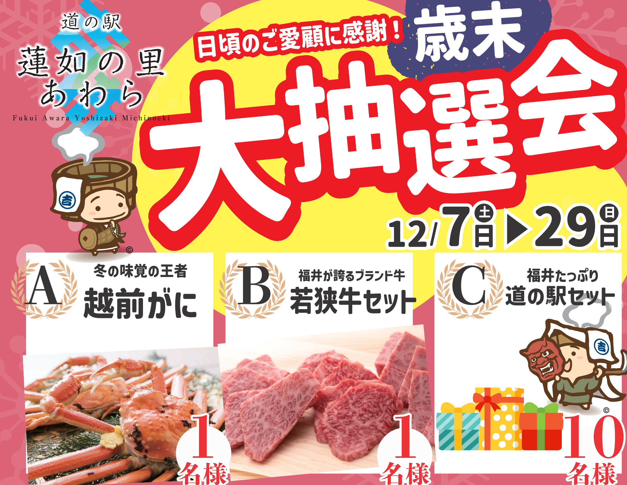 道の駅「蓮如の里あわら」(福井県あわら市)では、12月29日(日)までの期間中、日頃のご愛顧に感謝を込めて『歳末大抽選会』を開催しています。