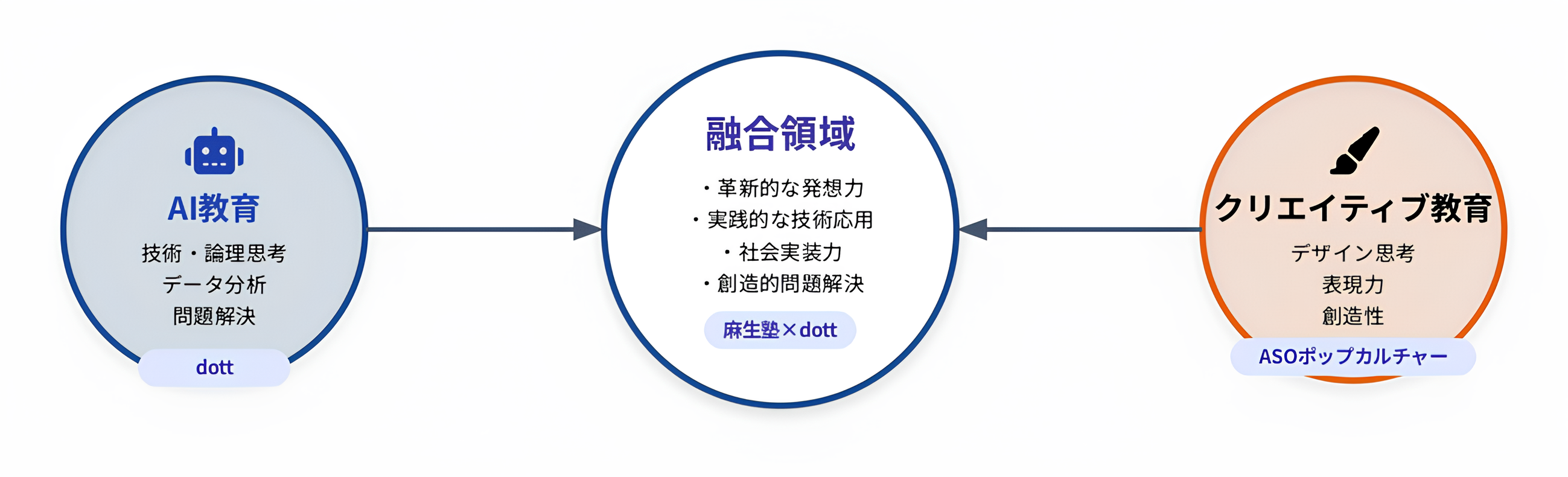 学校法人麻生塾が持つ「専門教育」と、株式会社dottが培ってきた「AI教育」のノウハウを融合し、AI時代に求められる即戦力人材の育成を共同で推進。今後は、各分野・業界ごとに必要とされるAI知識・レベルと学習到達基準を策定し、基準を満たした学生に対してAI教育連携のディプロマを発行予定です。まずは2026年度より、ASOポップカルチャー専門学校のクリエイティブ分野と取り組みを始めます。