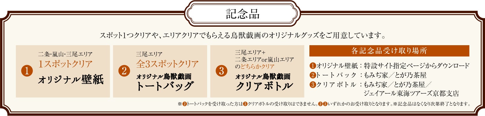 このイベントは京都の三尾、二条、嵐山を巡り、鳥獣戯画のキャラクターたちとともに謎解きを通じて、地域ごとの歴史や観光スポットなどのガイドを楽しめる体験周遊型イベントです。鳥獣戯画デザインのオリジナル記念品も用意しております。