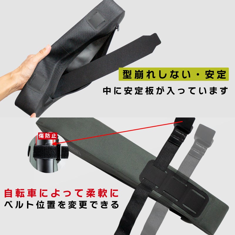 自転車のフレームに綺麗にマッチします。防水効果抜群なので急な雨も気になりません。様々なフレームに合うようにベルト穴が複数あります。