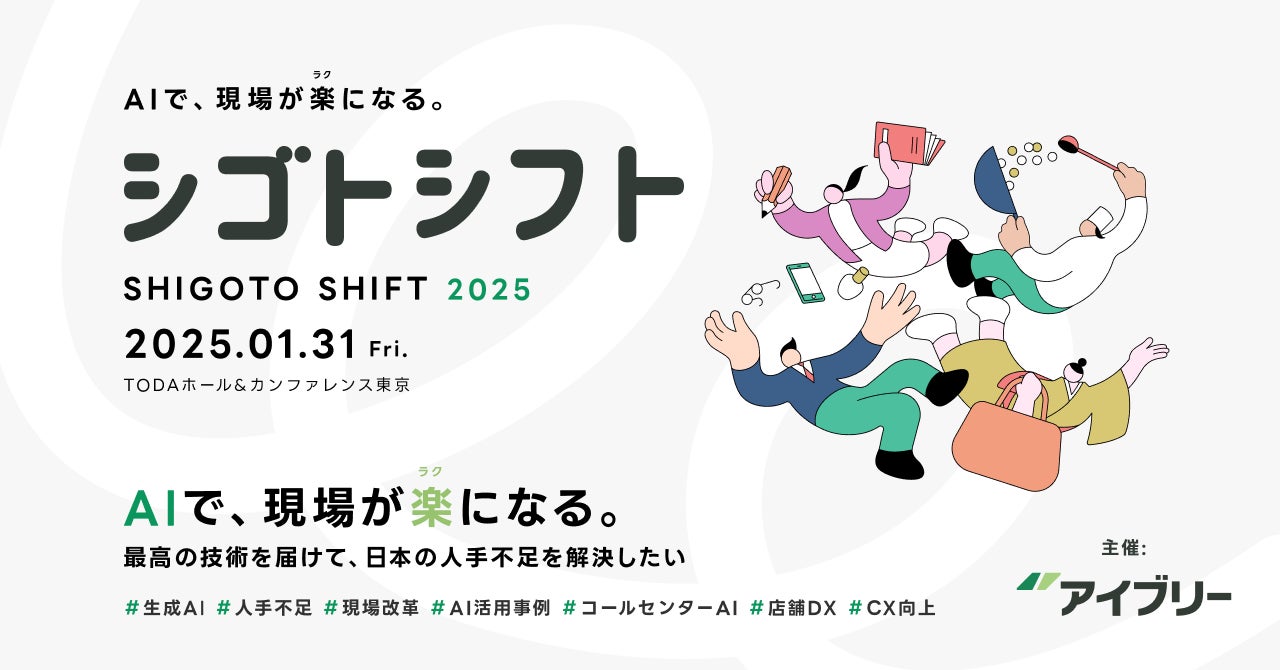 対話型音声AI SaaS「IVRy(アイブリー)」を提供する株式会社IVRy(本社:東京都港区、代表取締役/CEO:奥西 亮賀、以下「当社」)は、2025年1月31日(金)に「人材不足を乗り越えるAI活用の最前線」をテーマにしたカンファレンス「シゴトシフト2025 - AIで、現場が楽(ラク)になる。」を開催いたします。