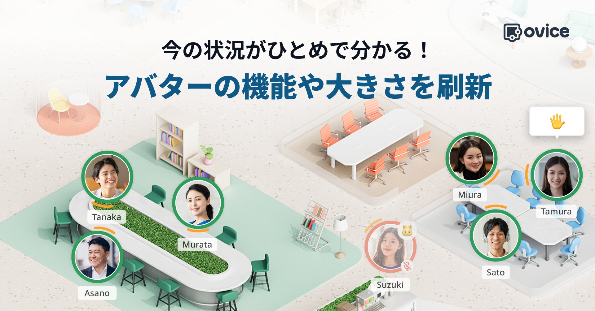 oviceはこれまでにオフィスやイベントの空間として多くの方に利用されてきましたが、そのなかで、「周囲の仲間が今どんな状況なのか、分かりやすくしてほしい」「ライブアバターを使用した際に、相手の表情がもう少しよく見えたらいいのに」、などのご要望をいただいていました。こうした声を受け、以下の通りアバターのデザインや機能をアップデートしました。