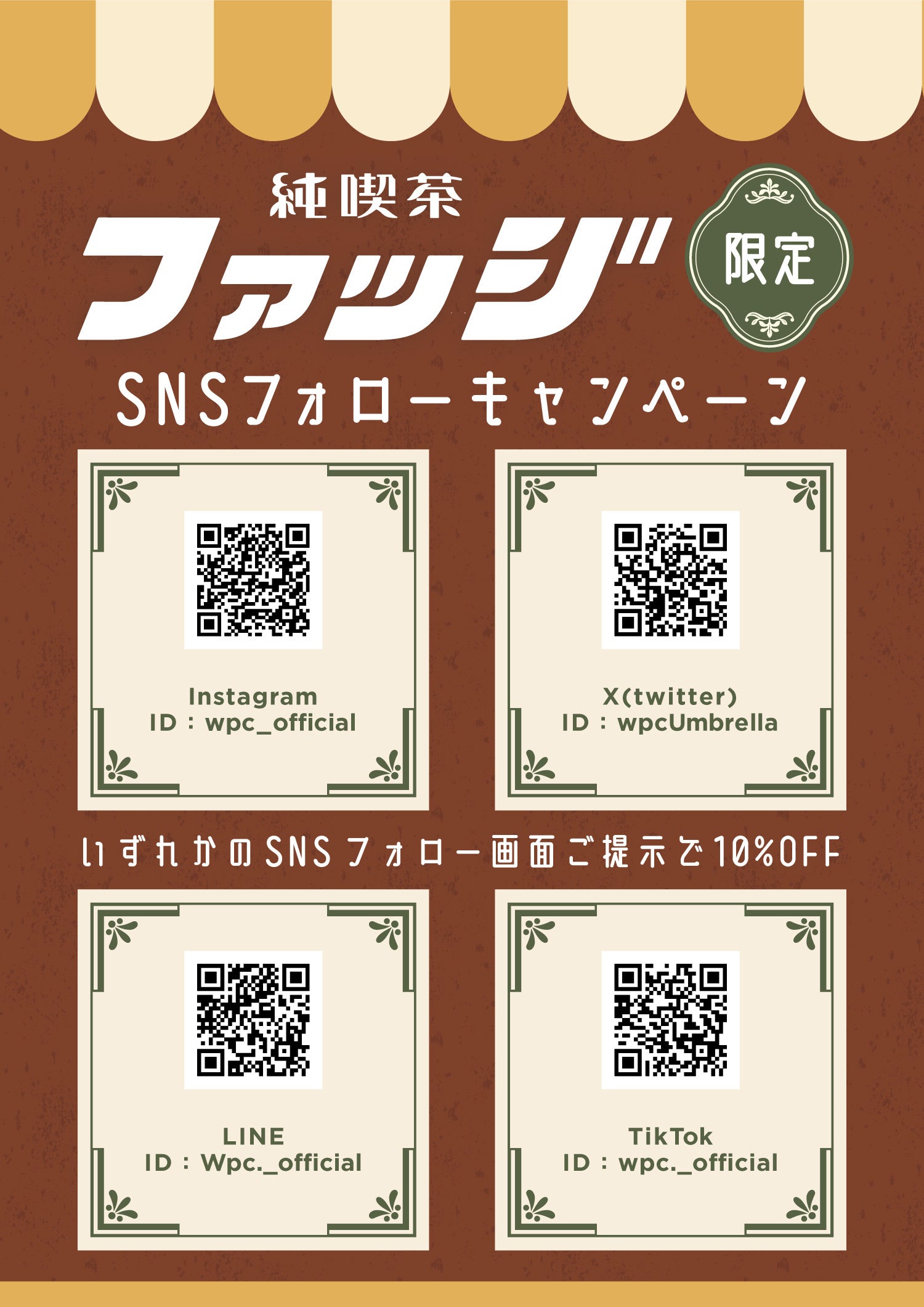 今回純喫茶ファッジ限定で、Wpc.のいずれかのSNSをフォローし、お会計時にフォロー画面をご提示いただくとWpc.商品が10%OFFになるキャンペーンを実施。秋冬のしっとりした雨に合う傘を純喫茶ファッジでぜひゲットしてみて。