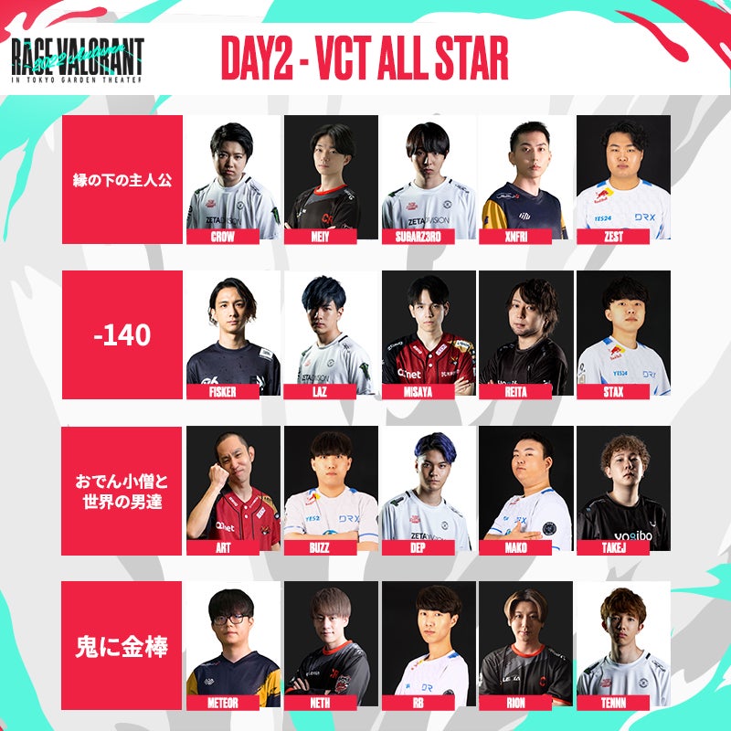 VCT ALL STARでは、ゲストプレイヤーとなるトッププレイヤー20名で構成された4つのチームが総当たり戦を行いました。各試合は13ラウンド先取で勝利となります。