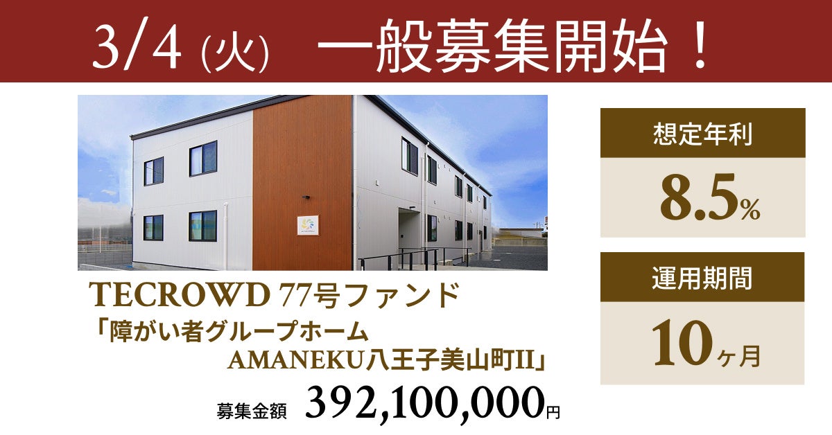 2025年3月4日(火)18時より77号ファンド「障がい者グループホーム AMANEKU八王子美山町Ⅱ」の募集を開始いたします。