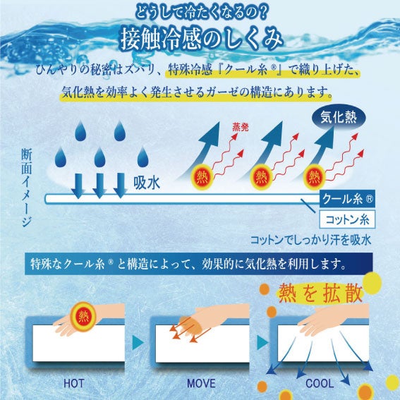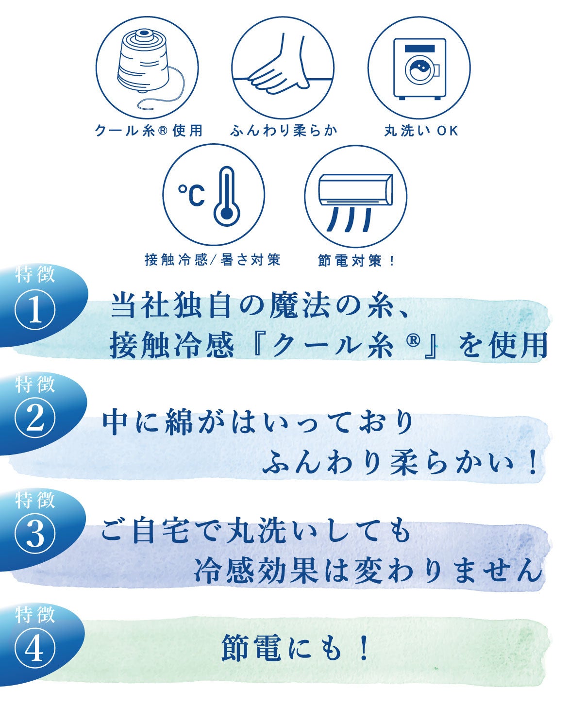 ・タイトル:綿でふわふわ、じわっと冷たい。コンパクトでどこでも使える。スーパークールシート