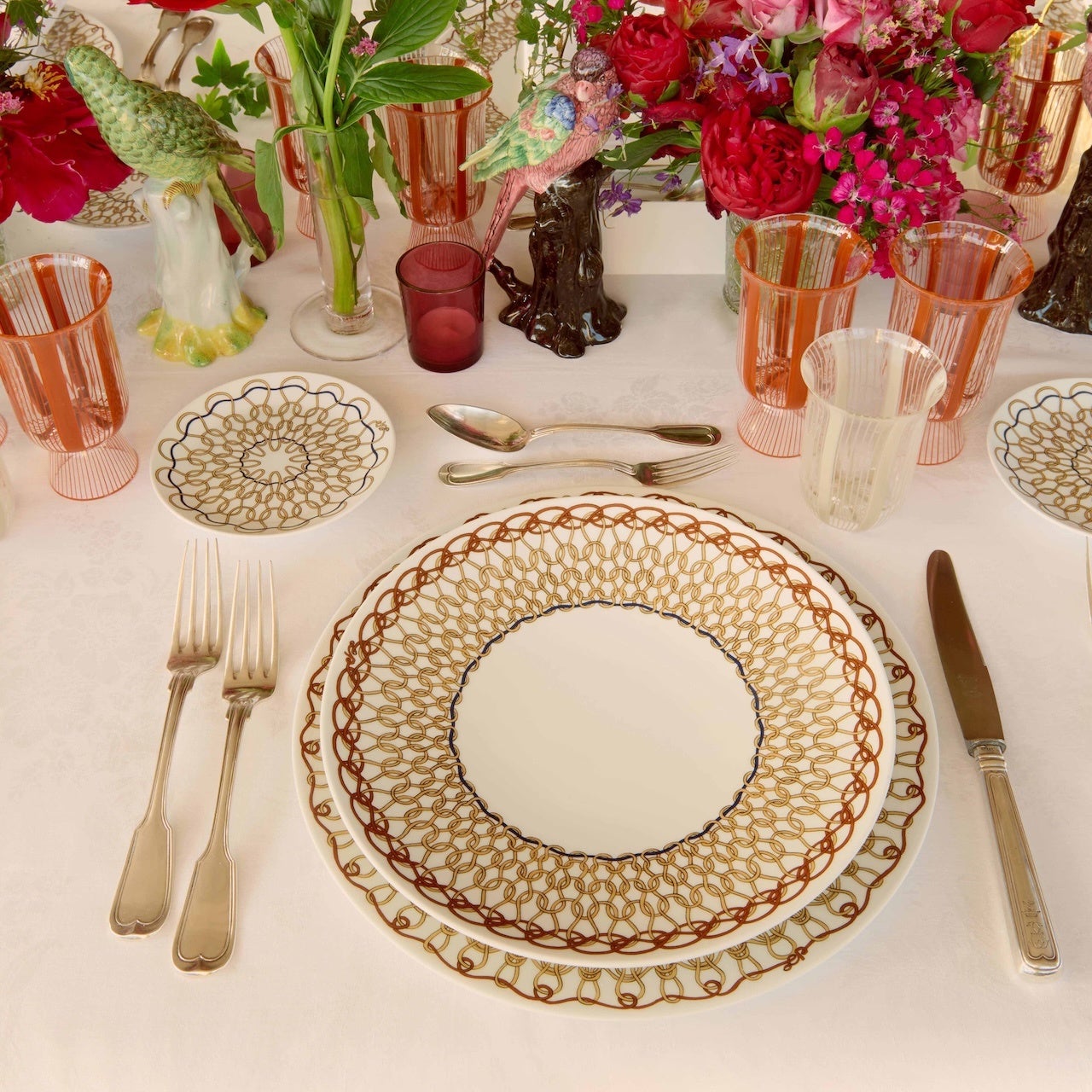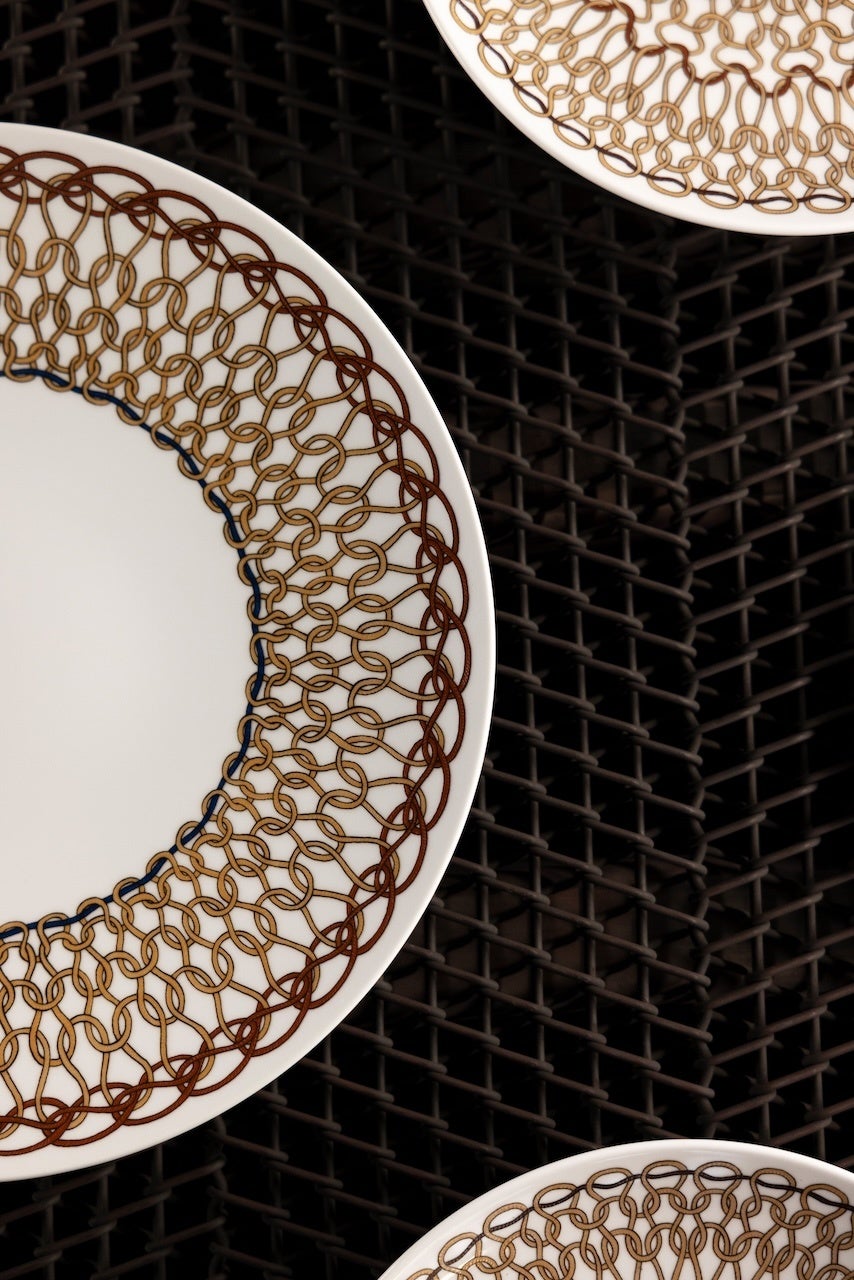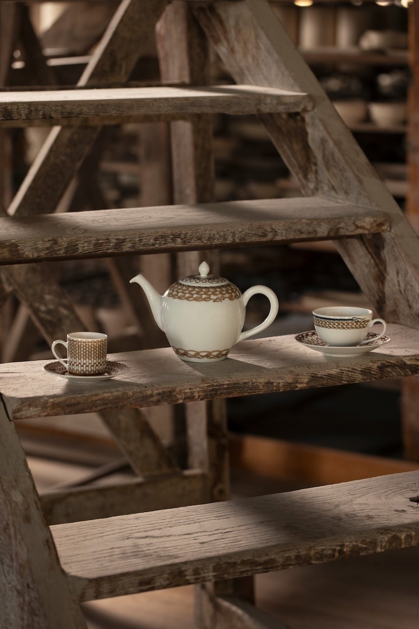 ロロ・ピアーナは、メゾンのテキスタイルの伝統を優雅に称えるエレガントなテーブルウェアコレクション〈プンティ・ア・マリア〉を発売いたします。ニットウェアの伝統から名付けられた本コレクションは、フランス・リモージュで職人の丁寧な手仕事により生まれます。ベージュ、クンメル、ネイビーブルー、バーガンディ、オークルといった色彩豊かな糸の結びつきや絡み合う模様が装飾され、フランスの卓越した磁器の伝統と、ロロ・ピアーナのニットウェアのノウハウが融合しています。