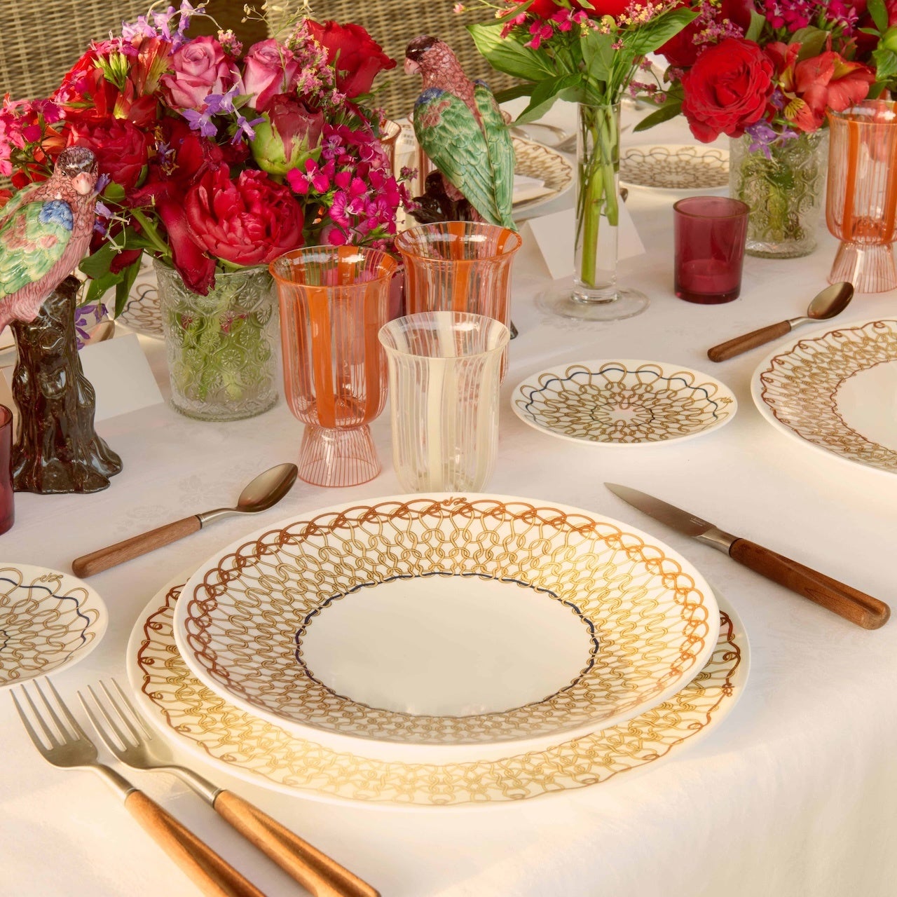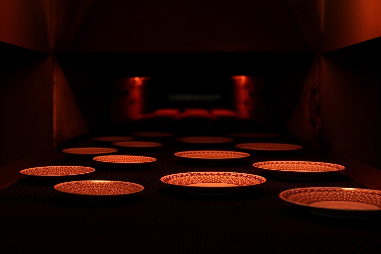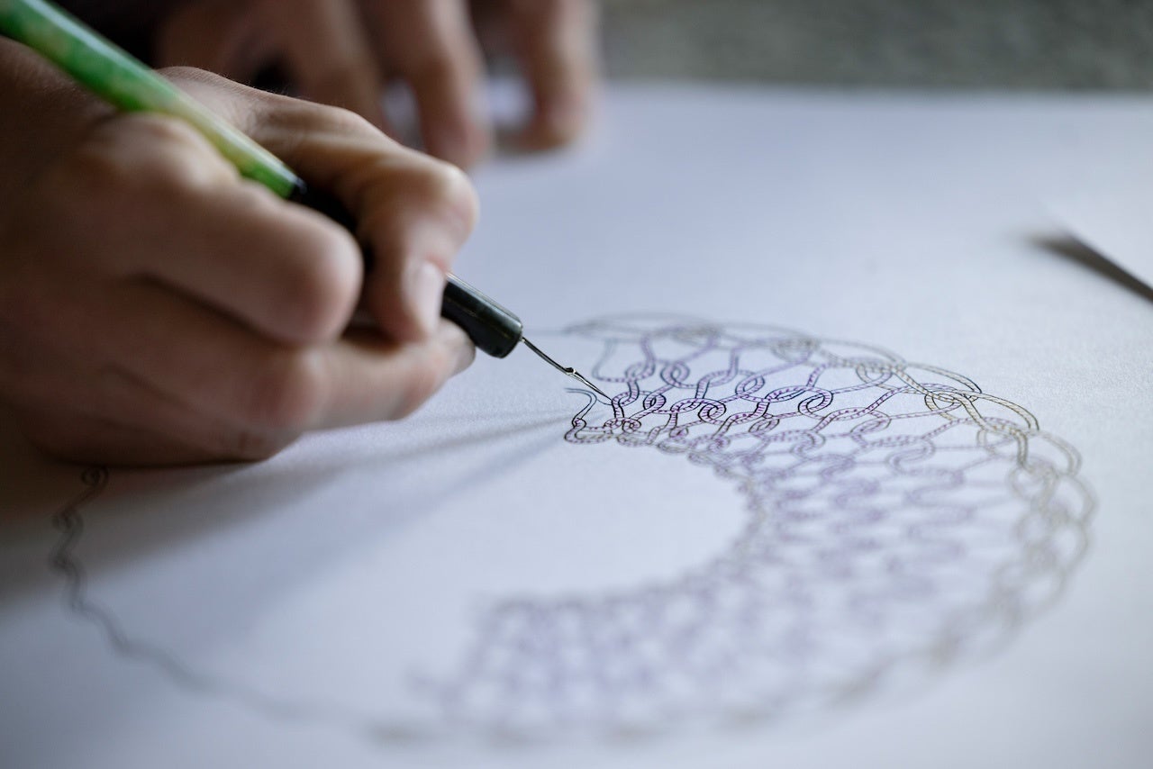 この磁器は、〈プンティ・ア・マリア〉のテーブルウェアを特徴づける複雑な装飾のための理想的なキャンバスです。非常に繊細で緻密に描かれた異なる色のラインが組み合わさり、重なり合うことなく奥行きを生み出しています。これらの色を開発するには無数の試行錯誤が必要であり、顔料内の酸化物が焼成時に異なる反応を示すため、目指す色合いを実現するためには、細心の注意を払う必要があります。
