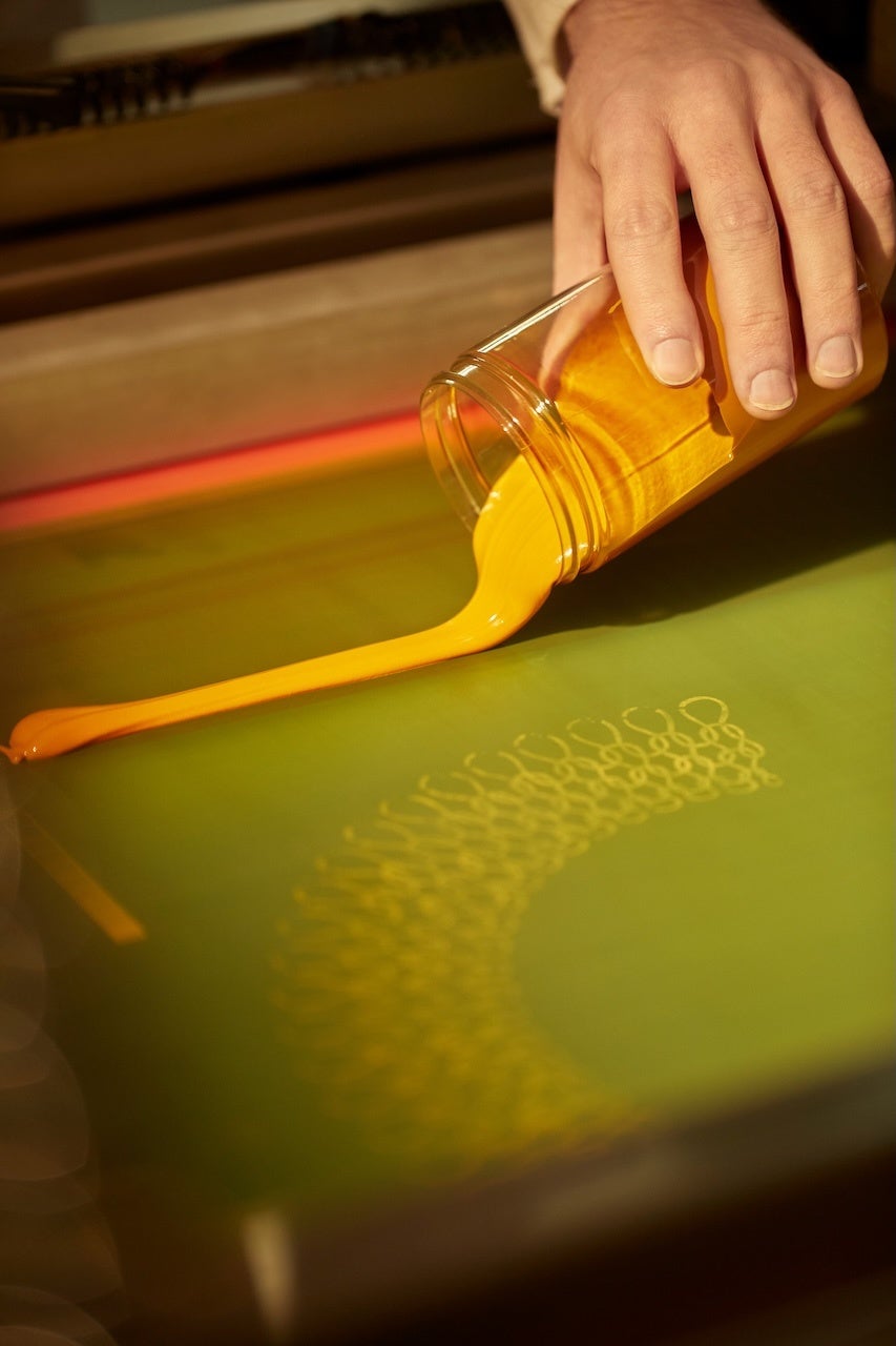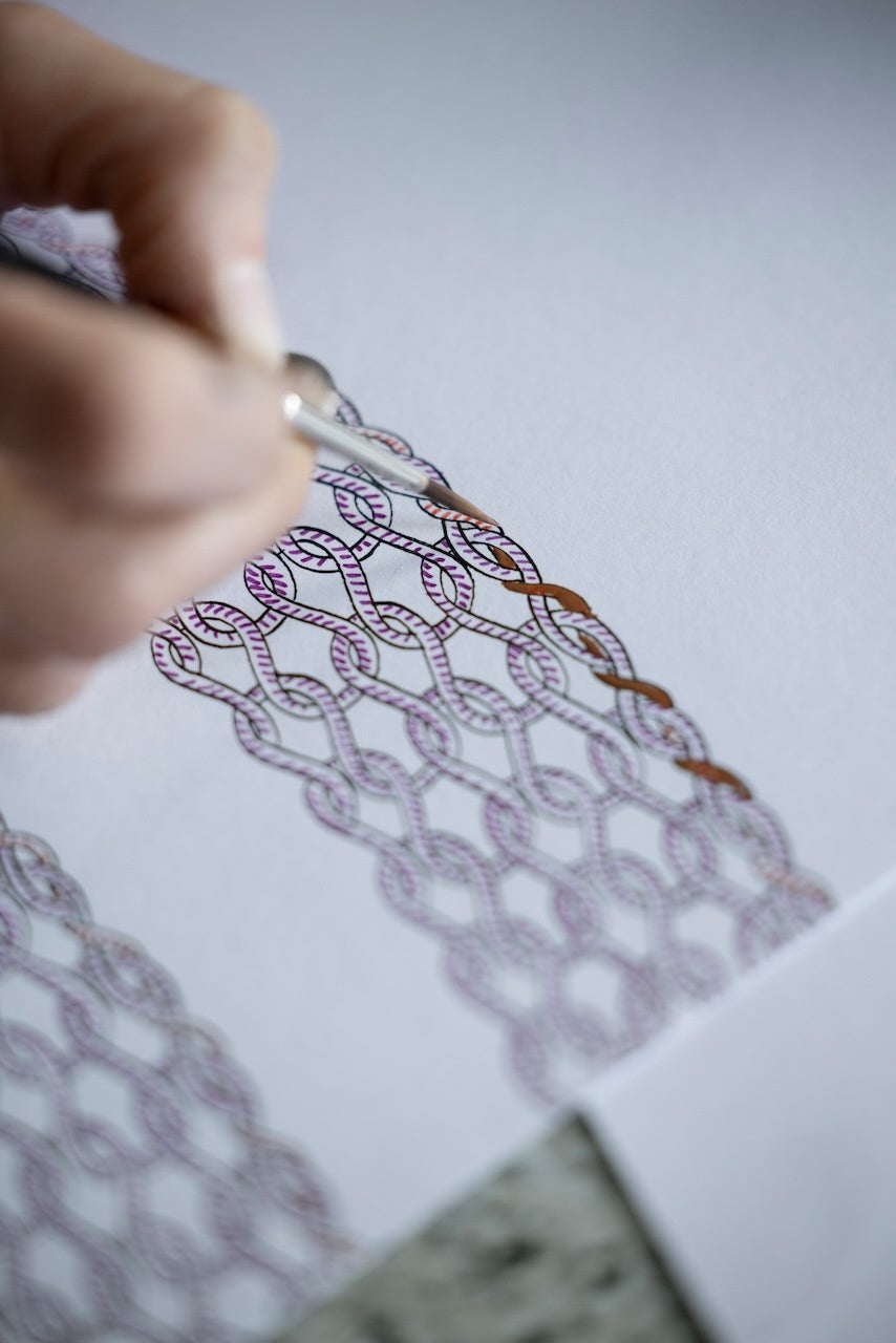 デザインを再現する職人たちも同様に細心の注意を払います。まず、デザインを特殊な支持体にスクリーン印刷し、次に有機フィルムを使って対象物に転写します。手仕事でデカールを調整し、すっきりとしたラインと完璧な配置を確保するには、卓越した精度が不可欠です。