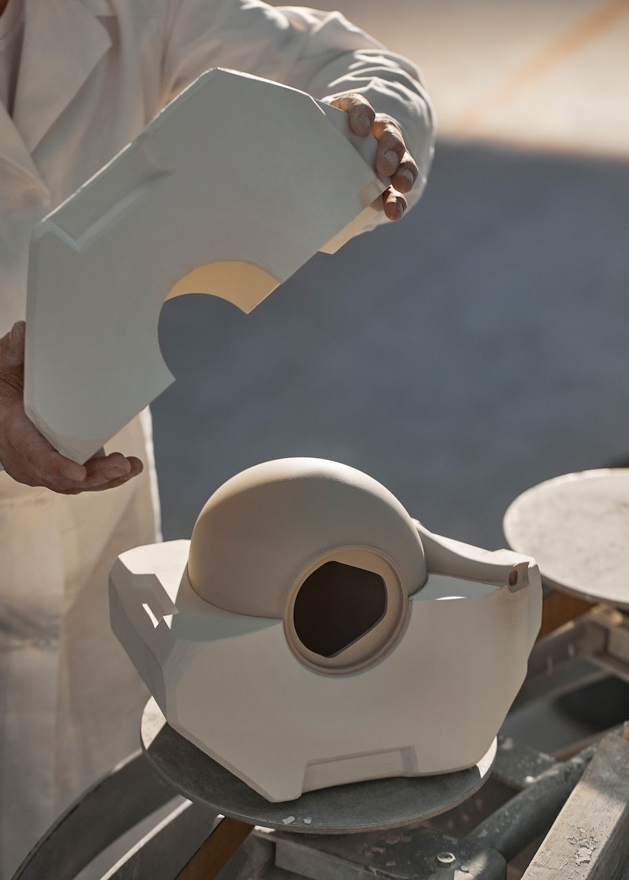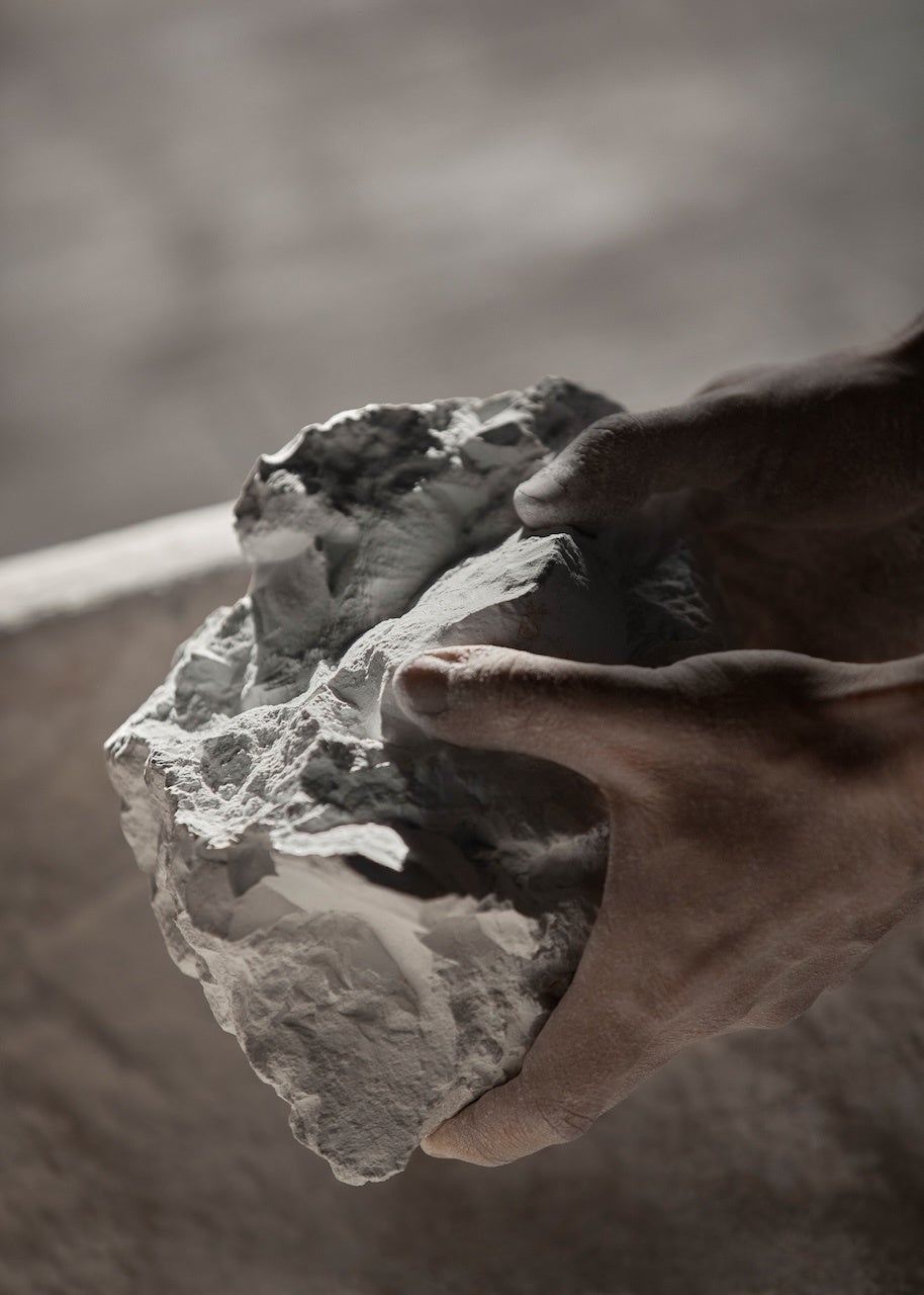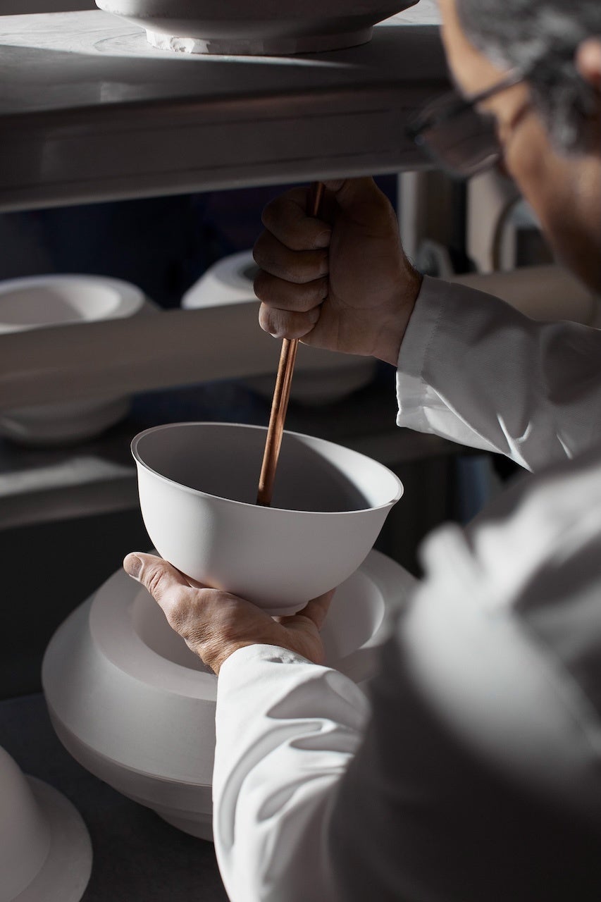 テーブルウェアを彩るニットステッチは、メゾンの卓越した技術へのオマージュであり、ヴァルセージアのロッカピエトラで熟練の職人によって織り上げられるカシミヤの柔らかさと、磁器のしなやかさを融合しています。糸と磁器はどちらも天然素材を起源としています。一方はカシミヤ、もう一方は土と鉱物であり、どちらも水、熱、蒸気のみで変容し、熟練の職人の手により生み出されています。
