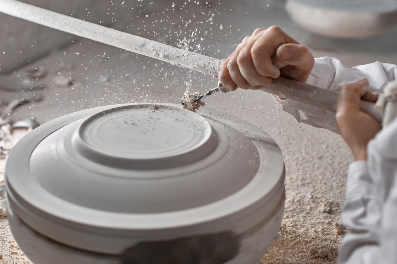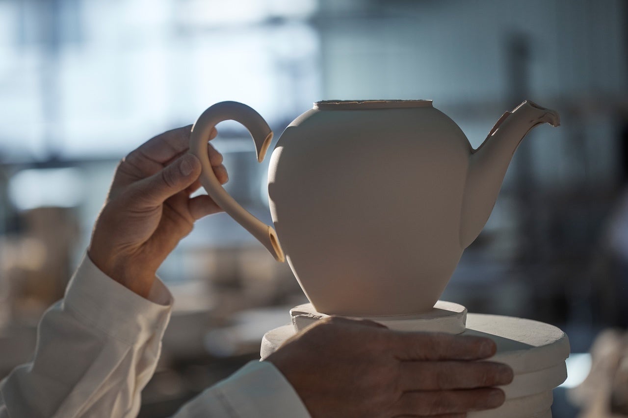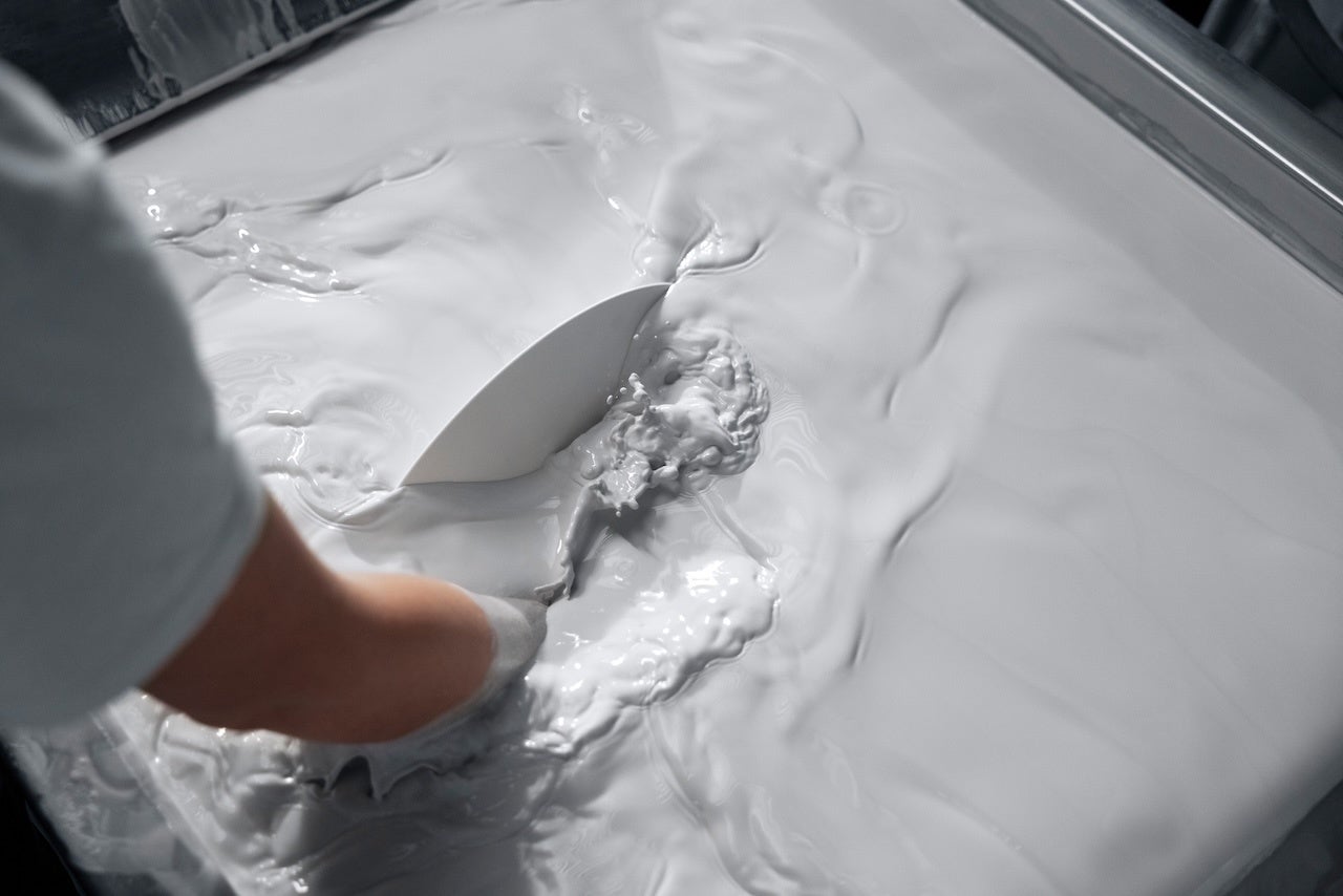 テーブルウェアを彩るニットステッチは、メゾンの卓越した技術へのオマージュであり、ヴァルセージアのロッカピエトラで熟練の職人によって織り上げられるカシミヤの柔らかさと、磁器のしなやかさを融合しています。糸と磁器はどちらも天然素材を起源としています。一方はカシミヤ、もう一方は土と鉱物であり、どちらも水、熱、蒸気のみで変容し、熟練の職人の手により生み出されています。