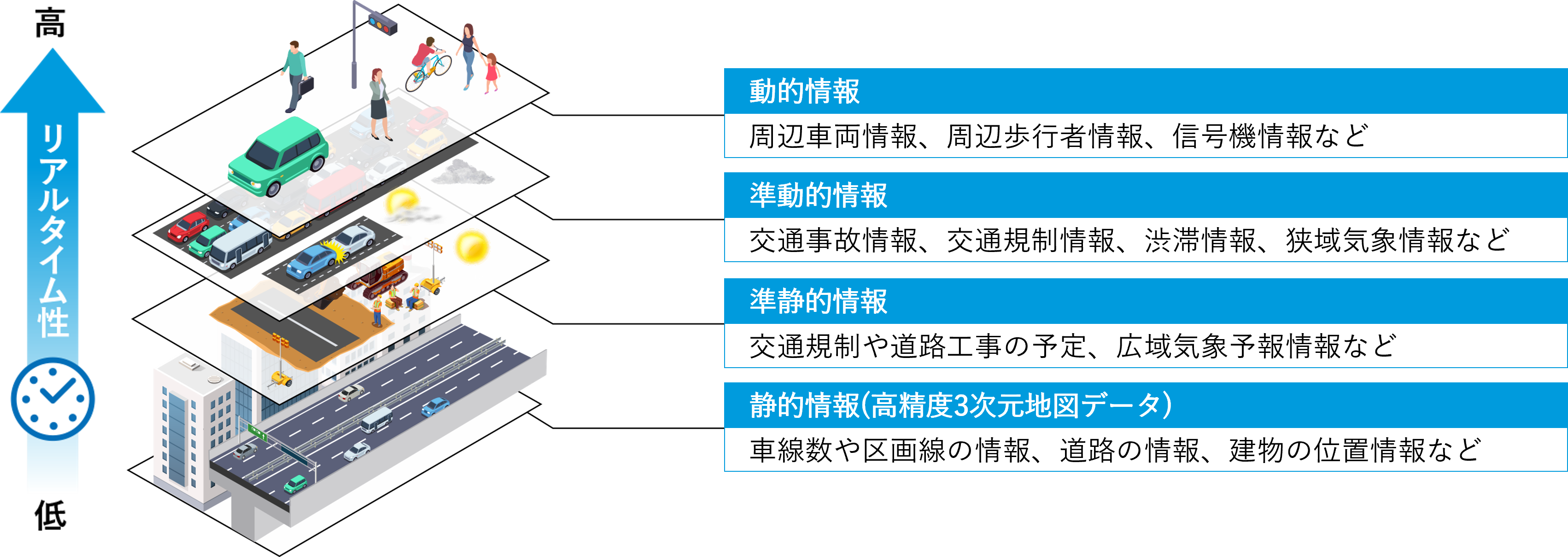 ※1 ダイナミックマップ情報:工事や故障車の停車などによる通行不可エリア等の静的情報や、航空機や車両の位置などの動的情報。情報のリアルタイム性ごとに静的・準静的・準動的・動的の4階層に分類された情報を持つ地図データベースである「ダイナミックマップ」を構成する情報