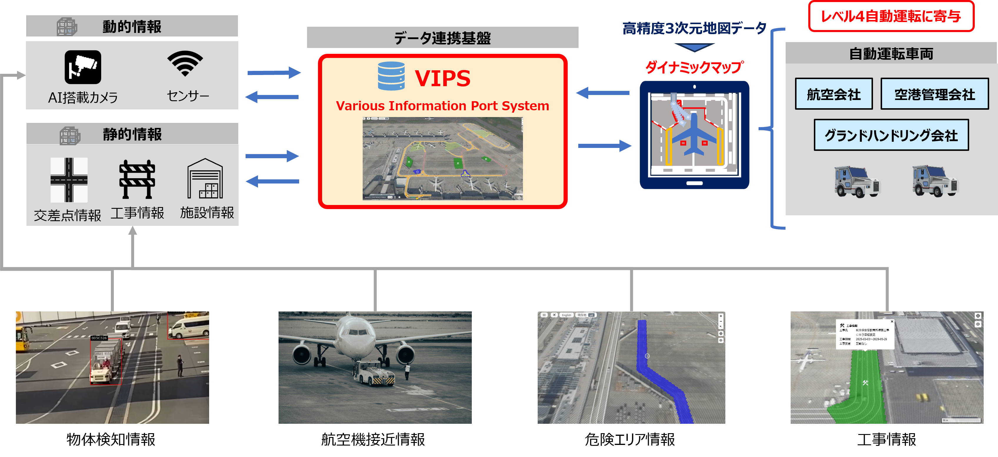 ダイナミックマップ情報は制限区域内のAI搭載カメラやセンサによって自動的に検出され、VIPSに登録されます。登録された情報は、自動運転車両が走行するエリアに応じて必要なもののみ車両システムに配信されます。配信された情報は車両システムに組み込まれた「高精度3次元地図データ」と統合され、静的情報と動的情報を重ね合わせた「ダイナミックマップ」として、自動運転車両の正確な走行に活用されます。この仕組みは空港だけでなく、港湾や物流センターなど他の施設でも利用可能であり、様々なエリアにおけるレベル4※2自動運転の実現に貢献します。