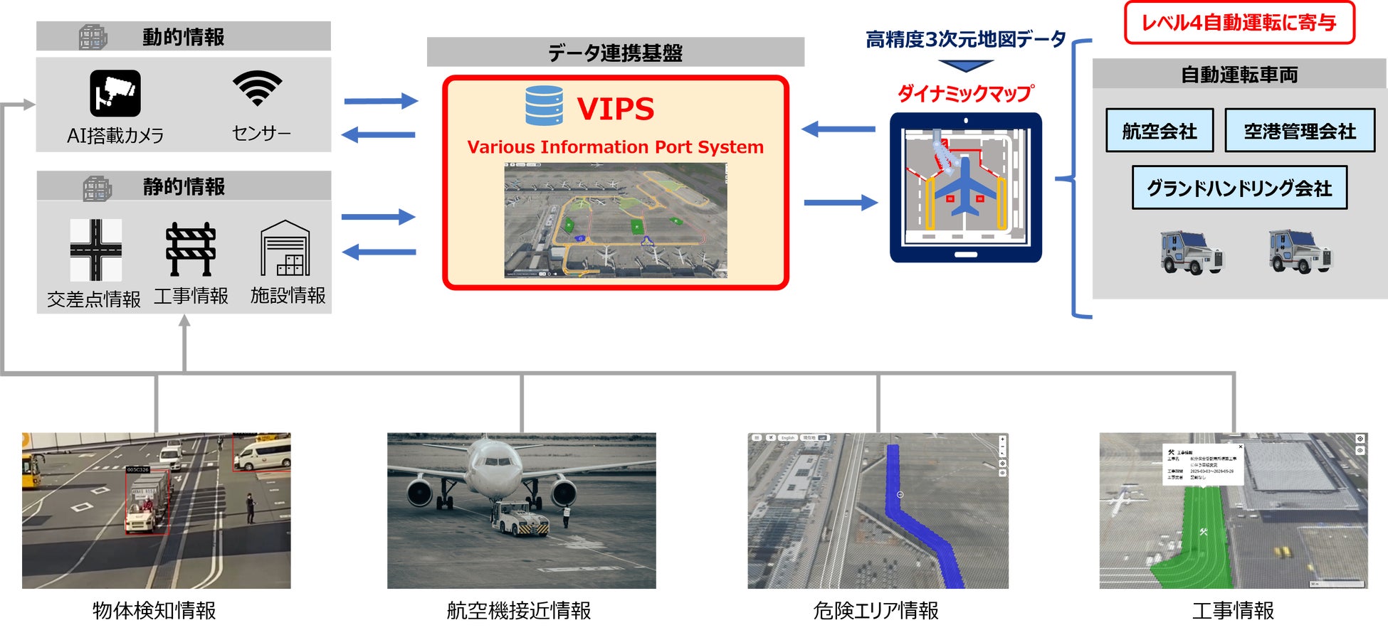 ダイナミックマッププラットフォームは、国土交通省の中小企業イノベーション創出推進事業(SBIR)を通じて空港内情報集約基盤「VIPS」の開発を進めています。VIPS(ビップス)とは、空港内の様々なダイナミックマップ情報※1を集約したデータ連携基盤のことです。
