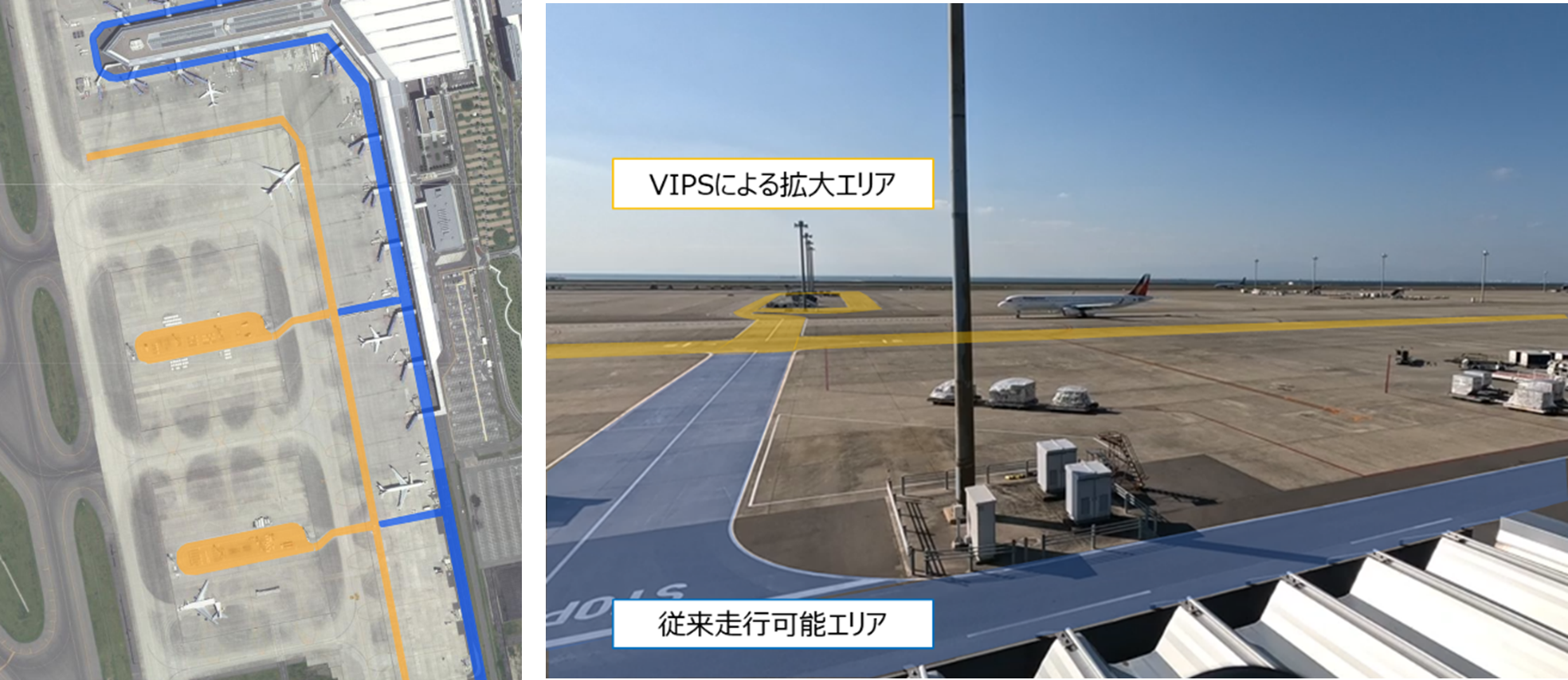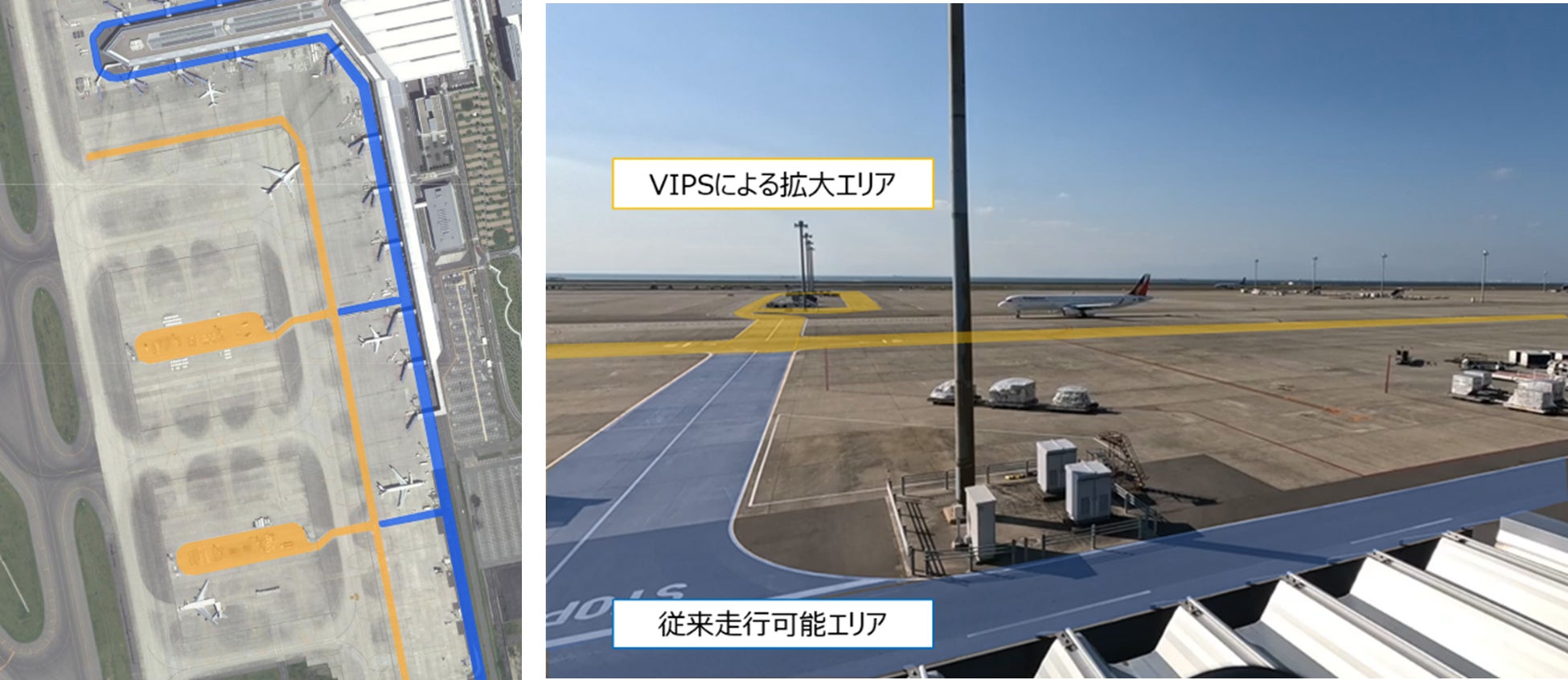 今回の実証ルートには、航空機の走行経路を横断する車両走行路であるサービスレーンが含まれています。サービスレーンでは車載のカメラやセンサのみで航空機の状況を確認することが難しく、レベル4自動運転の実装に課題がありました。しかしVIPSを活用すると航空機の位置がリアルタイムで認識できるため、システムによる走行可否判断が可能となります。これまでレベル4自動運転が可能なエリアはターミナル周辺に限られていましたが、VIPSを活用することでターミナルから離れた駐機場(沖止めエリア)まで拡大できます。