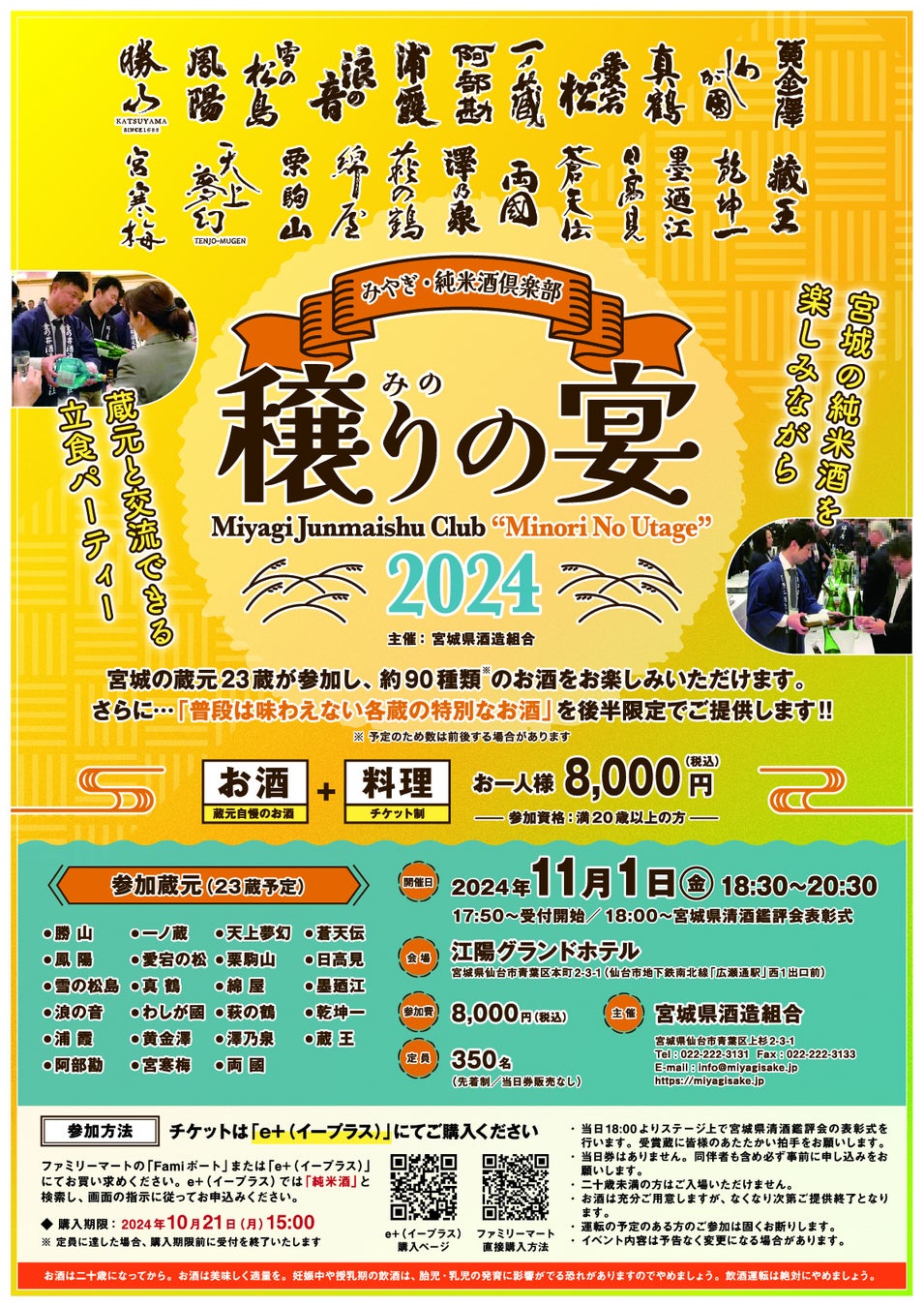 宮城県酒造組合は、2024年11月1日(金)に仙台市青葉区本町「江陽グランドホテル」において、宮城の日本酒を楽しむ立食パーティ『みやぎ・純米酒倶楽部 穣りの宴』を開催いたします。