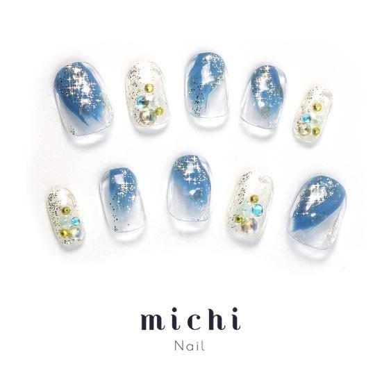 クリアベースにブルーのスラッシュデザインが大胆なこちらのネイル。色合いもこの季節にぴったりで、視覚からも爽やかな気分にしてくれます。シャンパンゴールドとラメは炭酸飲料のようなさっぱり感があり、梅雨から真夏まで楽しめるネイルです!