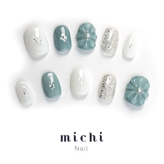 くすみブルーとホワイトが涼しげなこちらのネイル。キャンディーのようなぷっくり感が可愛らしいく、シルバーのグリッターも輝きます。普段使いはもちろん、水着に合わせても可愛いです!