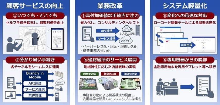 手続きのセルフ化、および、印鑑や伝票、通帳などの現物レス、ペーパレス化により、行員の事務負荷を軽減し、高度で専門性の高いコンサルティング業務の強化など、より重要とされる領域への注力、地域の特性やニーズに応じた柔軟な店舗戦略の実現を可能とします。