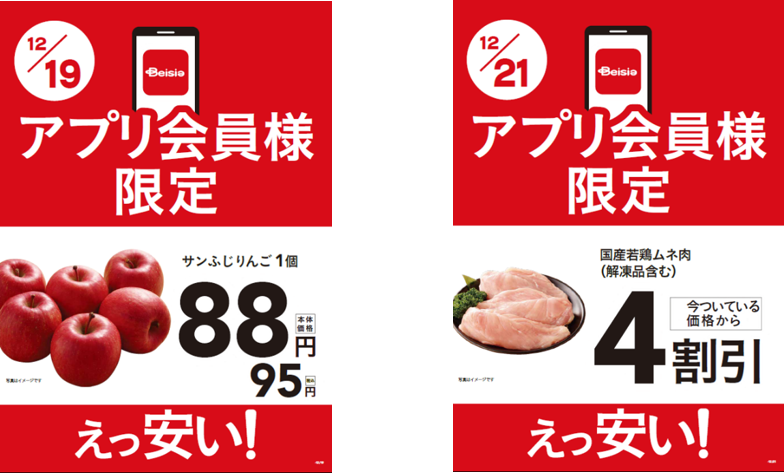 株式会社ベイシア(本社:群馬県前橋市、代表取締役社長:相木孝仁)は、12月19日(月)から12月21日(水)の3日間で、「ベイシアアプリ会員様限定 シークレットセール」を開催いたします。日頃よりベイシアアプリをご愛顧いただいている皆様へ感謝を込めて、「えっ安い!」が満載のシークレットセールです。このお得な機会をぜひお見逃しなく!