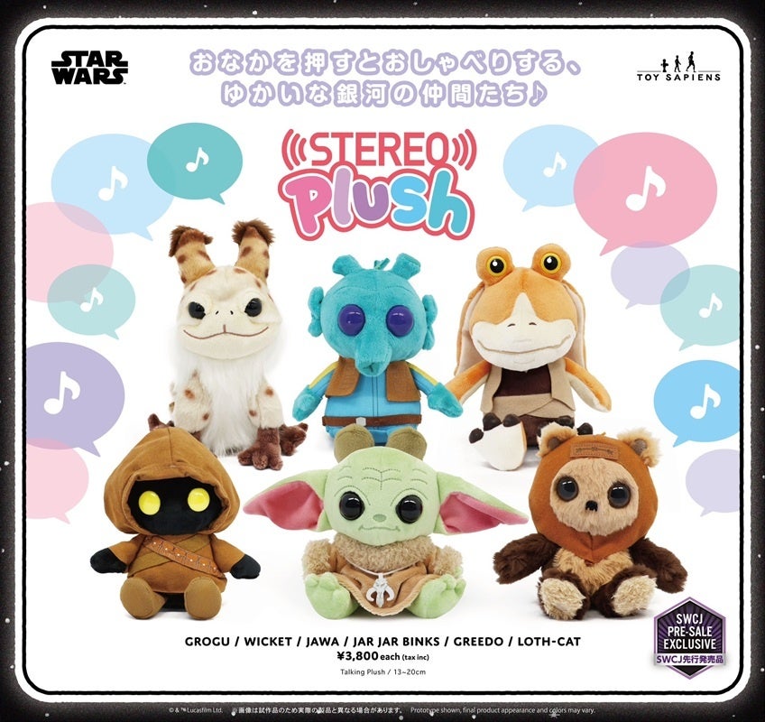 ホットトイズのフラッグシップ・ストア「トイサピエンス」のオリジナルアイテムに、サウンド機能がついたキュートなぬいぐるみの「ステレオぷらっしゅ」シリーズが登場。ラインナップは、グローグー、ウィケット、ジャワ、ジャー・ジャー・ビンクス、グリード、ロズ=キャットの全6種。サイズは高さ約13~20cm。おなかを押すと、キャラクターにちなんだ音や声などが出るギミックを搭載しているぞ。素材はやわらかくて触り心地の良いファブリックを使用。頭についたループ状の紐を使用して、キーチェーンなどにすることも可能だ。