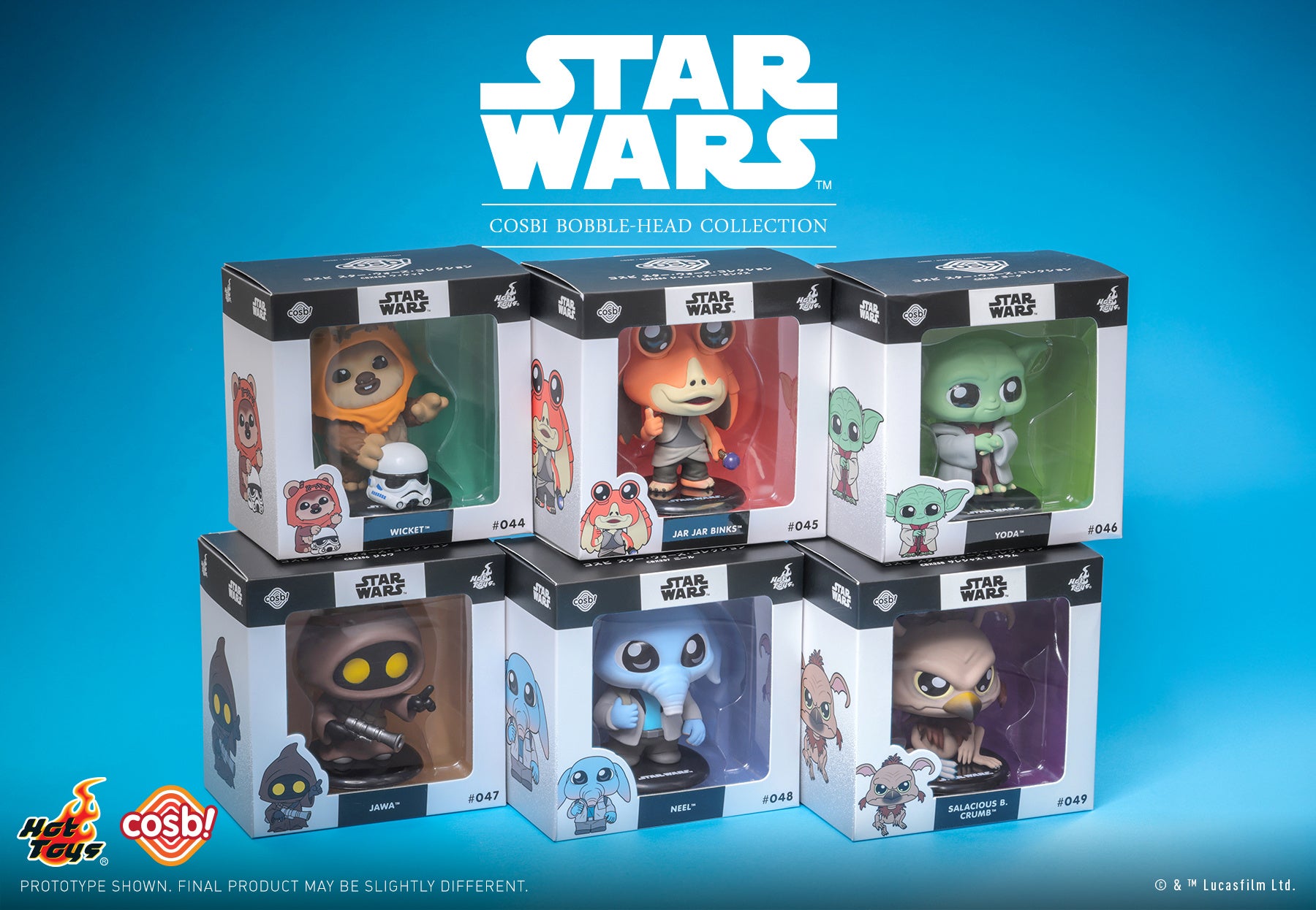 ホットトイズがお贈りする、シンプルで愛らしいフォルムと集めやすいサイズが特徴的なデフォルメフィギュア「コスビ」のスター・ウォーズ・コレクションに、日本限定アイテムが登場!ラインナップは、ウィケット、ジャー・ジャー・ビンクス、ヨーダ、ジャワ、ニール、サレシャス・B・クラムの6種。高さは約8cm、ヘッドはプルプル揺れる姿がユニークな、ボブルヘッドとなっている。日本で企画されたオリジナルのパッケージは、そのまま飾っても可愛いウィンドウボックス仕様。