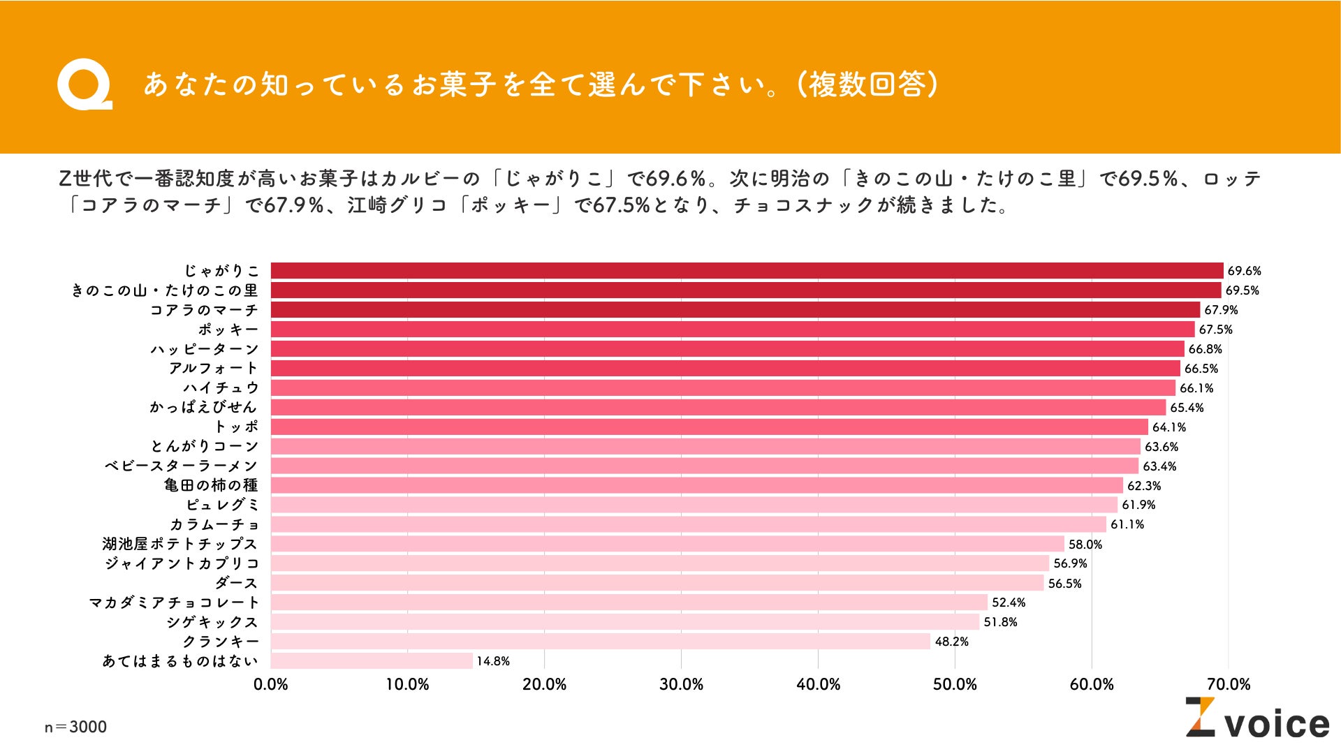 その結果、Z世代で一番認知度が高いお菓子はカルビーの「じゃがりこ」で69.6%。次に明治の「きのこの山・たけのこの里」で69.5%、ロッテ「コアラのマーチ」で67.9%、江崎グリコ「ポッキー」で67.5%となり、チョコスナックが続きました。