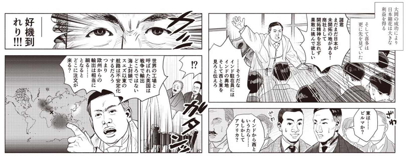 世界一周視察を終えた日本綿花の喜多又蔵は、綿糸だけでなく綿布の輸出を拡大するよう指示。喜多は荷役が集中していた神戸港の負担を軽減するため、綿花の大阪への直輸入を開始し、また世界各国の事情を知る若手として、紡績業界で一目を置かれる存在となっていた。大戦勃発により、一時的な市況の暴落、紡績業界の操業短縮にも動じず、逆に欧州からの製品輸出は細り、日本に大量の注文が入ると予想し、見事に的中させ、日本の紡績業界の飛躍のきっかけを掴む。