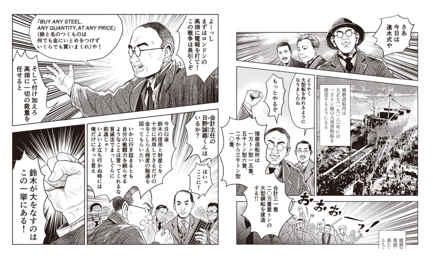 鈴木商店は、世界中に優秀な若手社員を派遣し、鈴木商店独自の通信網を構築していた。大戦が勃発すると、日々世界中から届けられる電報を見た金子直吉は、世界情勢と実需を見極め、「BUY ANY STEEL, ANY QUANTITY, AT ANY PRICE」(鉄と名のつくものは何でも金に糸目をつけずいくらでも買いまくれ)と大号令を発する。そして調達した鉄材で船舶を発注し、自ら造船業へ進出を画策するため川崎造船社長の松方幸次郎に相談する。
