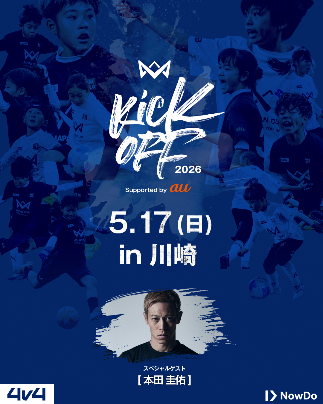 Now Do株式会社(所在地:東京都新宿区、代表取締役:本田圭佑)が運営する4人制サッカー全国大会「4v4」は、2026年シーズンの幕開けとして「4v4 KICKOFF 2026 Supported by au(以下、本企画)」を5月17日(日)に開催いたします。本企画は、全国各地で切磋琢磨する仲間たちが同日に一斉にキックオフを迎えることで、4v4を通じて日本中が一つになり、新シーズンの輝かしいスタートダッシュを鮮やかに飾る特別な「無料大会」です。