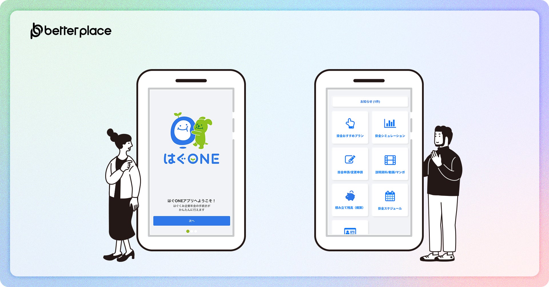 ベター・プレイスが開発している「はぐONE」は、「はぐくみ企業年金」の導入法人において事務手続きの負担を軽減できるほか、加入者(従業員)は、掛金の申請や積立額の確認などをスマートフォンで簡単に行うことができるシステムです。