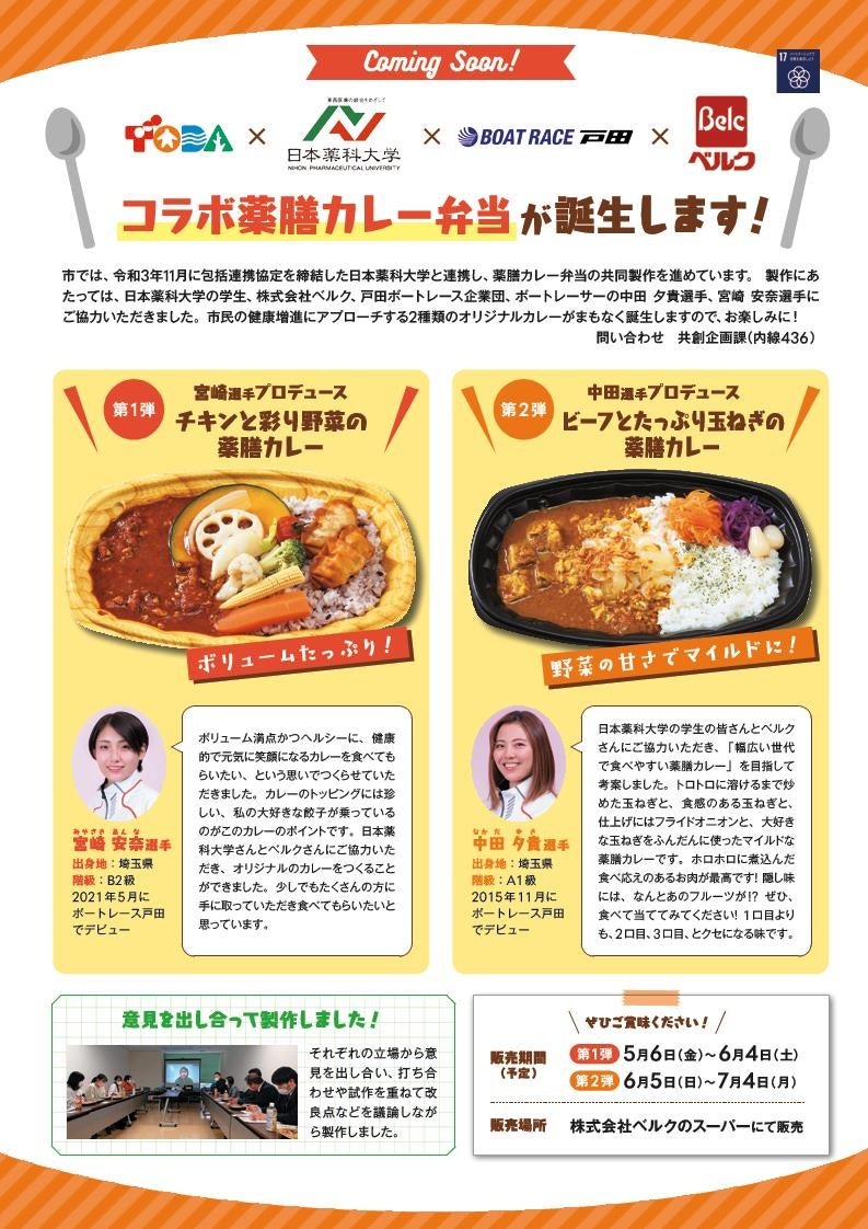 戸田市、日本薬科大学の学生、株式会社ベルク、戸田ボートレース企業団、ボートレーサーの宮崎安奈選手、中田夕貴選手と連携し、協議を重ねて薬膳カレー弁当2種類を開発しました。