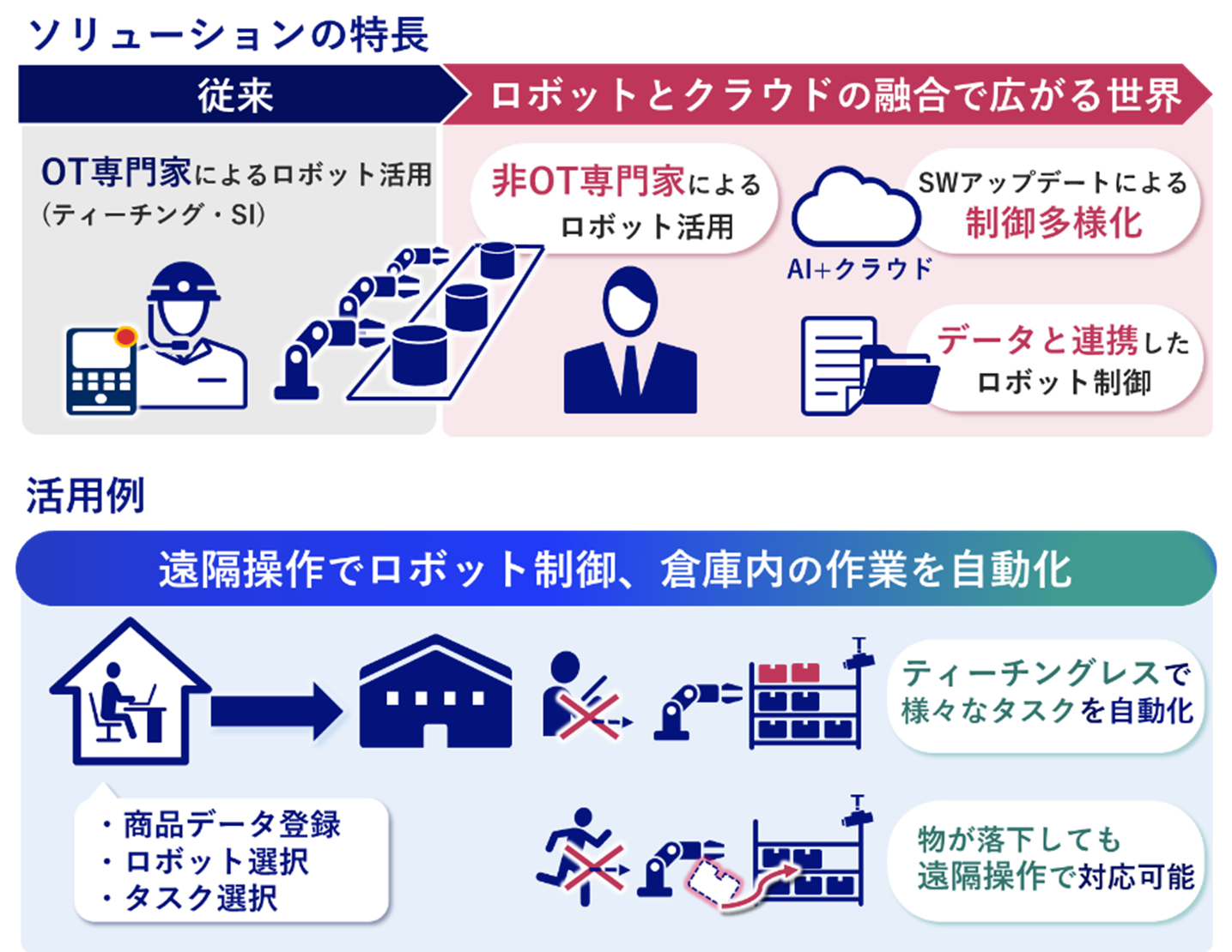 近年、物流倉庫や工場における労働力不足の解決手段として、ロボット導入のニーズが増えています。しかし、一般的にロボットの導入には、専門家によるティーチングや個別の設定が必要となり、物品の整列や箱入れ等のロボットにとって複雑な作業を自動化するには多くの時間を要します。本ソリューションは、ロボットとクラウドの融合を実現し、AIとデータを活用することで、専門家でない作業者でも簡単に、日々変動する多種多様な現場の作業をロボットで自動化することができます。