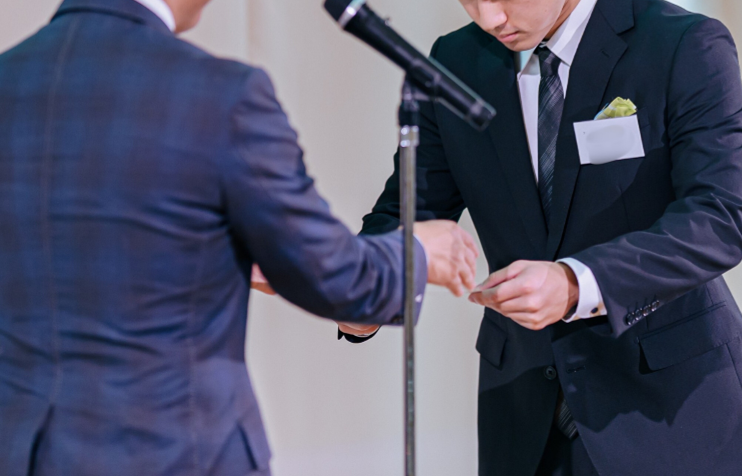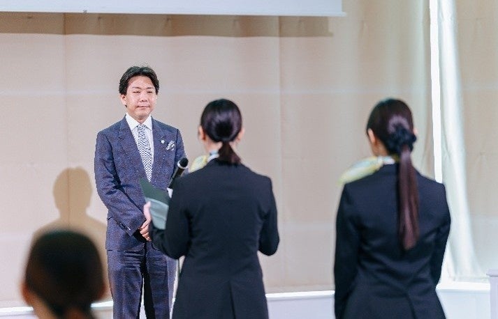 式典終盤では取締役が登壇し、クロージングスピーチを行いました。今後はサービスを受ける側から提供する立場になるため、入社までの半年の間に「プロとしての意識」を養い、加えて「健康の維持」や「自己研鑽(学習の習慣化)」に励み、最高の状態で社会人としてのスタートを切ってほしいと、内定者に熱く伝えました。取締役自身の常に学び続ける姿勢も示され、未来の仲間として共に成長していくことへの強い期待が語られました。