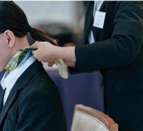 式典開始前には、先輩社員が内定者一人ひとりに、現場で実際に着用するスカーフの結び方のレクチャーを行うというQueenswayらしい特別なひとときが設けられました。