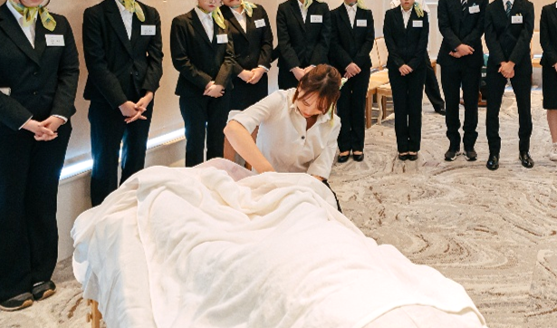 これはプロのセラピストとして、お客様をお迎えする「身だしなみ」と「ホスピタリティ精神」を伝承するという想いが込められています。先輩社員の温かい歓迎の気持ちと共に結ばれたスカーフを纏い、内定者は式典に臨みました。