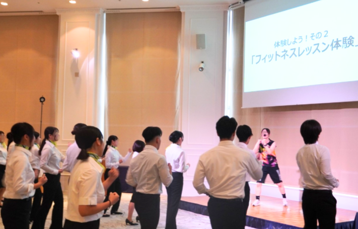 リラクゼーションに続き、フィットネス事業の柱である「BEST STYLE FITNESS」のスタジオレッスン体験を実施しました。内定者は最初は恥じらいながらも、先輩社員インストラクターのリードで活気あふれるレッスンに楽しんで参加。この体験を通じて、会社のもう一つの事業の柱である「健康」の価値を体感するとともに、身体を動かすことの楽しさと一体感を共有しました。