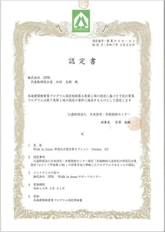 株式会社DTS(東京都中央区、代表取締役社長 北村 友朗)は、3D住宅CADソフト「Walk in home(ウォークインホーム)」のオプション機能である「Walk in home 許容応力度計算オプション Version 3.0」において、木造建造物電算プログラム認定を取得しました。