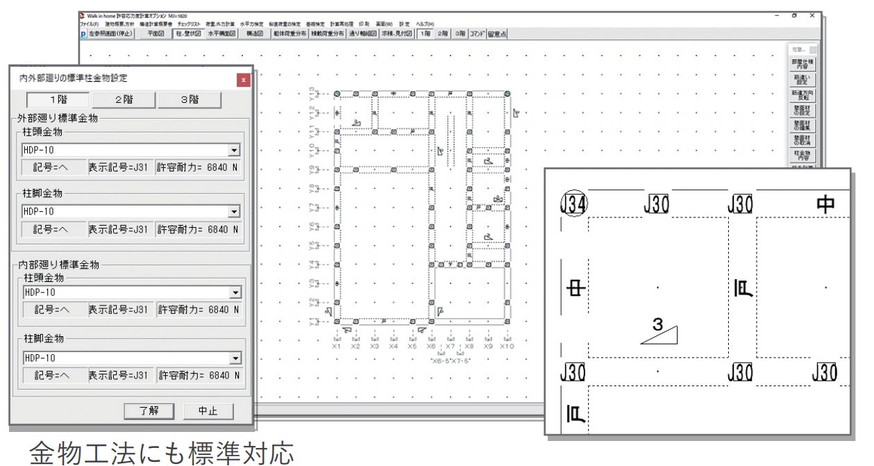 在来工法と同様に、入力した平面図や構造図などのデータから、自動で金物工法(HSフレーム金物)に対応した計算処理で構造計算を行ないます。