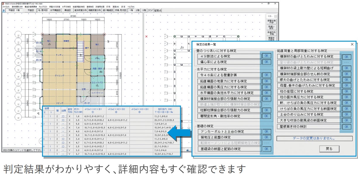 間取りプランおよび構造伏図の完成後、構造計算画面に入るだけで許容応力度計算の各検定を自動計算します。検定項目および判定結果の一覧を見れば、ひと目で分かる判定結果。また、各検定項目をクリックすれば、それぞれの計算結果や関連情報を確認することができます。
