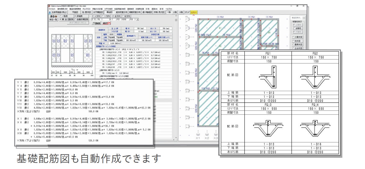 基礎配筋図や底盤配筋図を自動作成します。また、基礎梁の断面や配筋、アンカーボルトの検定にも対応し、検定の結果が確認しやすいように、応力図や計算内容、伏図等を同時表記しています。