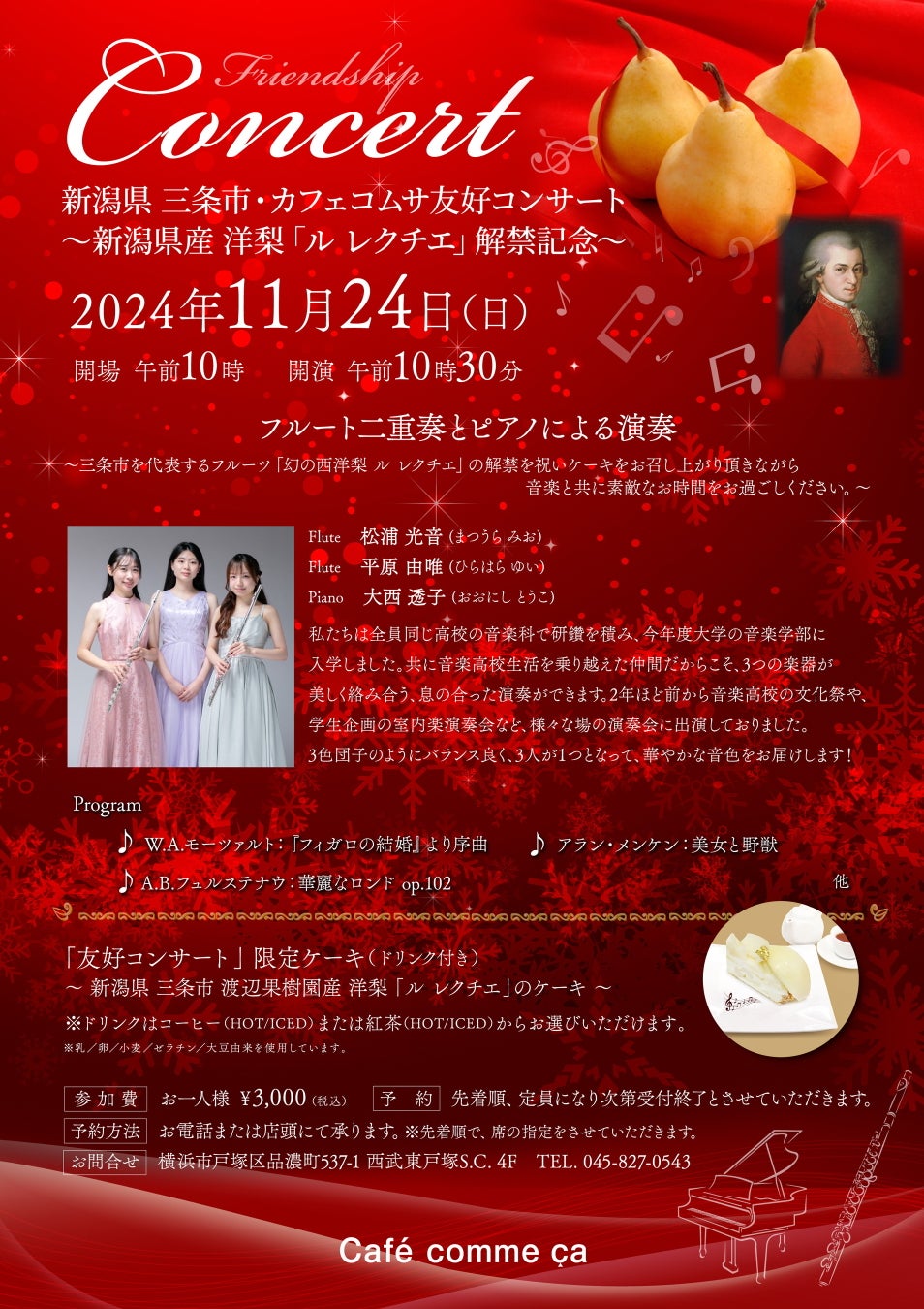 日本全国に25 店舗を展開し、フルーツをふんだんに使ったスイーツが特徴のカフェコムサが、「幻の洋梨 ル レクチエ」の解禁を祝い、音楽鑑賞とともにケーキを召し上がっていただく素敵な時間を提供します。提供する限定ケーキには、モーツァルトの音楽を聴かせて追熟させた渡辺果樹園のル レクチエを使用。この特別なケーキを堪能いただく空間として、会場ではモーツァルトの生演奏が流れ、三条市長がル レクチエの魅力を語ります。