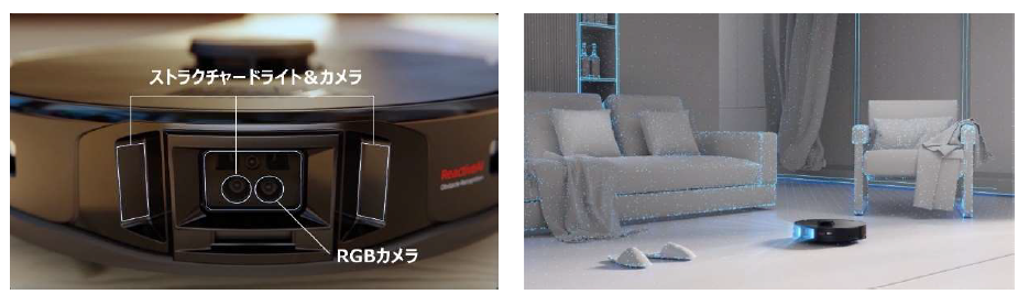 物体の距離や形状を判断する顔認証技術の原理を活用したストラクチャードライトとカメラおよび、画像から物体の特徴を捉えるRGBカメラの2種類のカメラを搭載。家具や小物などをAIが瞬時に分析し、位置や種類を特定します。計8種の障害物(スリッパなどの履物・ペットの排泄物・布類・電源タップ・コード・台座・体重計・ちりとり)や、計4種の家具(ベッド類、複数人掛けのソファ類、テレビスタンド、ダイニングセット)等も認識し、回避するだけでなくそれらをアプリ上に表示します※9。カメラに関するプライバシー保護については、「ユーザーセキュリティ保護のためのTUV認証」※10を取得。撮影された動画や画像のデータは、保存されないため、安心してご利用いただけます。