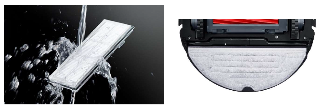 本体用のエアフィルター、モップクロス、ダストボックスは、簡単に取り外しができ、水洗いが可能です。エアフィルターは2日に1時間の使用で約10カ月間交換が不要です。