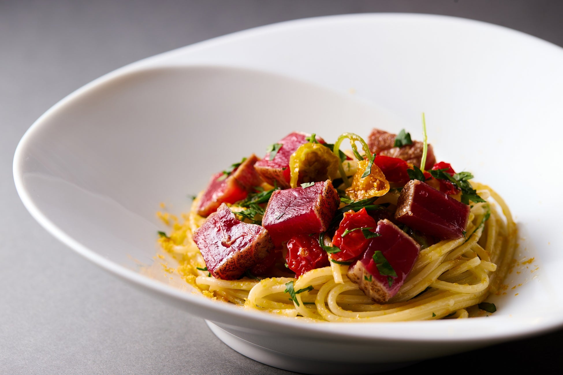 クロマグロの表面を炙り、マグロのカラスミをトッピング。相性の良いニンニクとトマトのソースに絡めています。彩り豊かに、目でもお楽しみいただけるメニューです。