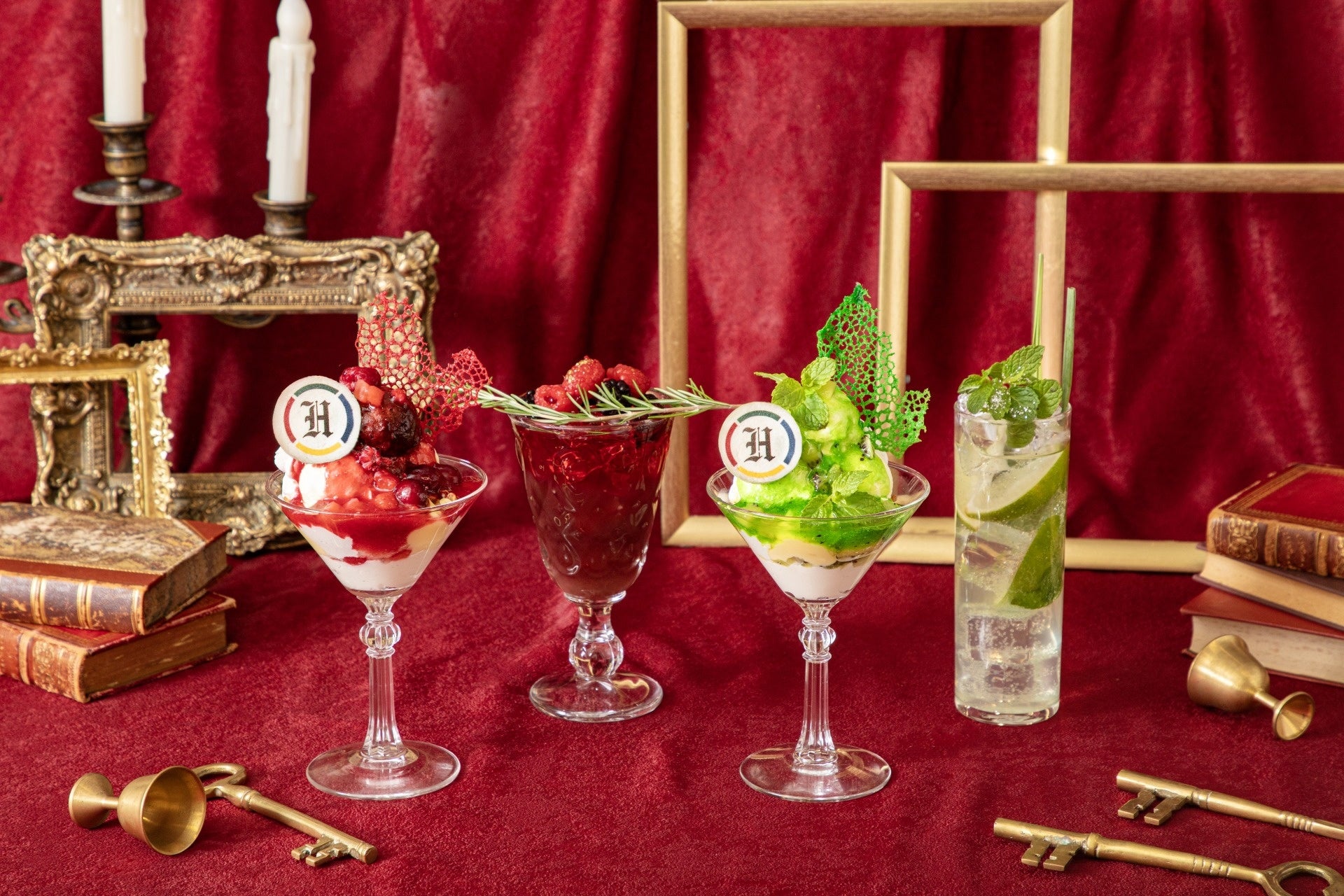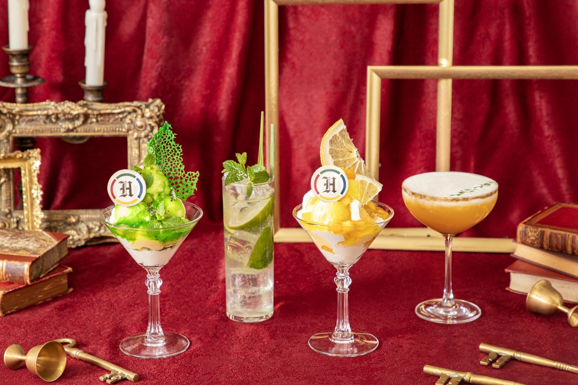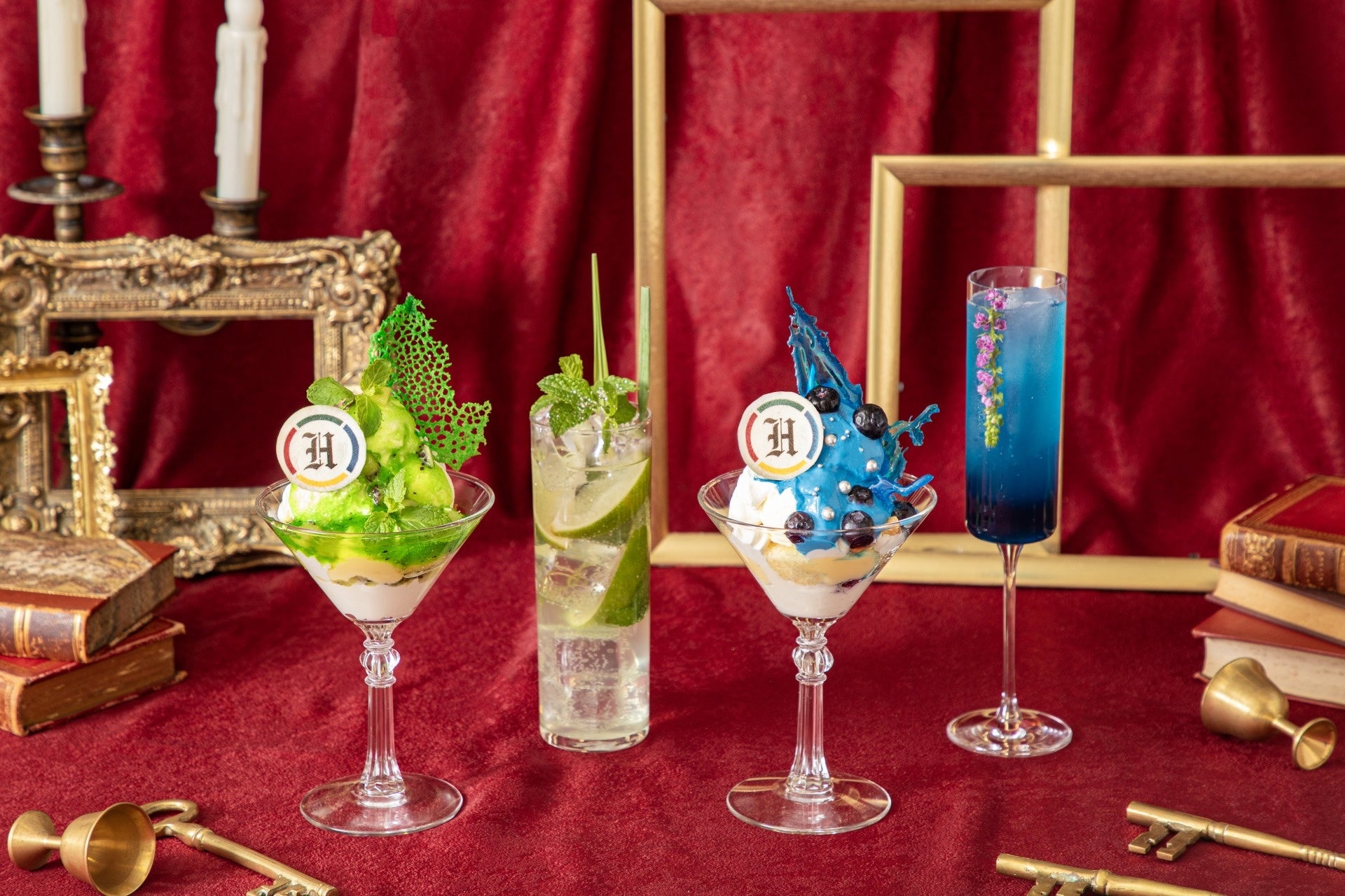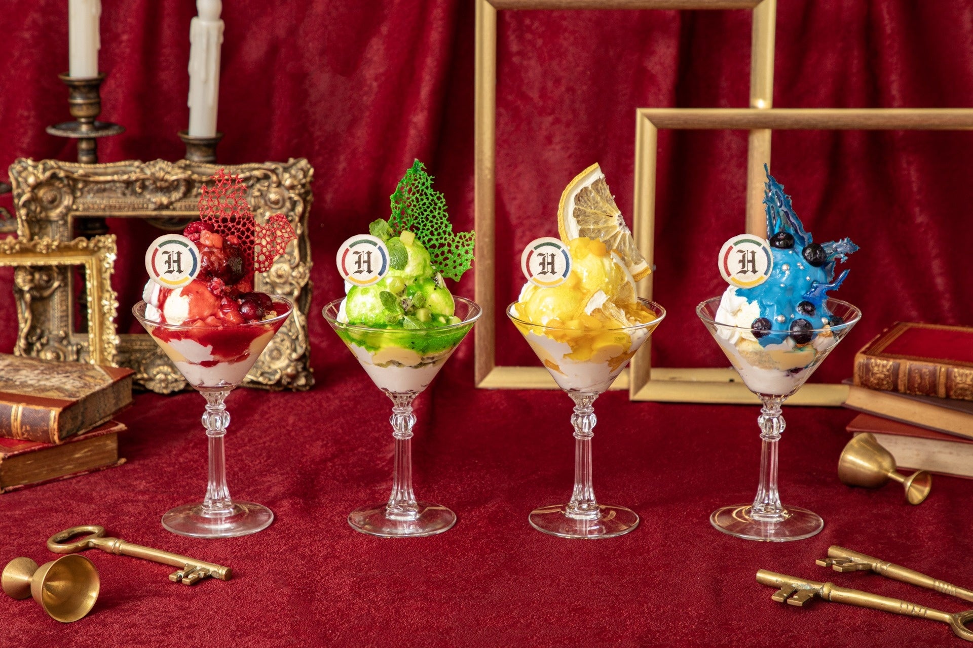 2024年8月30日(金)より順次期間限定で提供開始の新メニューは、4寮をイメージしたノンアルコールカクテルと、2種のアイスをのせ、カラフルなソースで仕上げたパフェで、どのメニューも思わず写真に撮りたくなるフォトジェニックで華やかなスペシャル感溢れるメニューとなっています。また、ドリンクとパフェのセットメニューやグッズなどもご用意いたしました。
